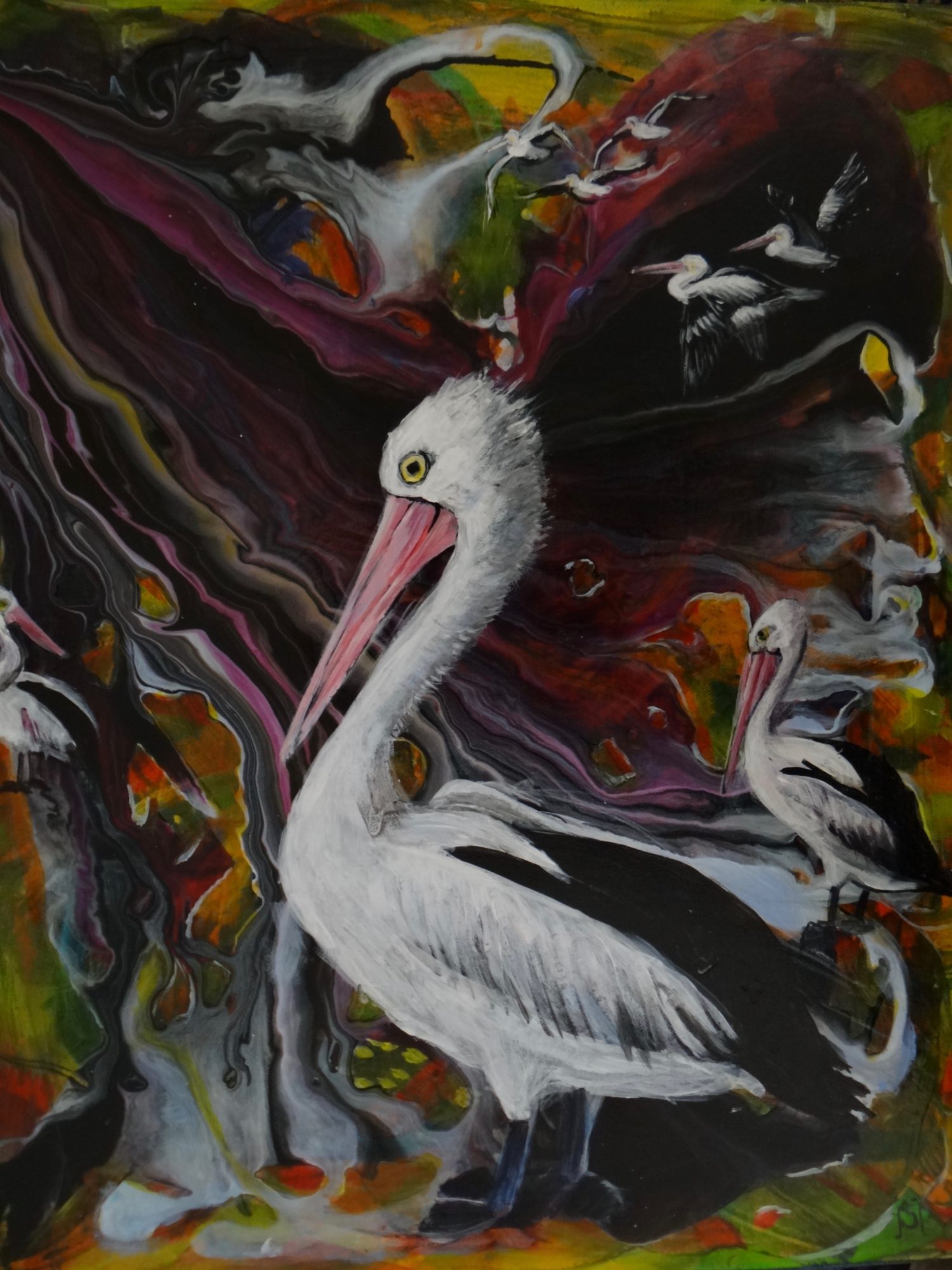 Bright contemporary painting of pelicans and flood waters. Mixed Media – pouring medium and acrylic paints on canvas-ready to hang.