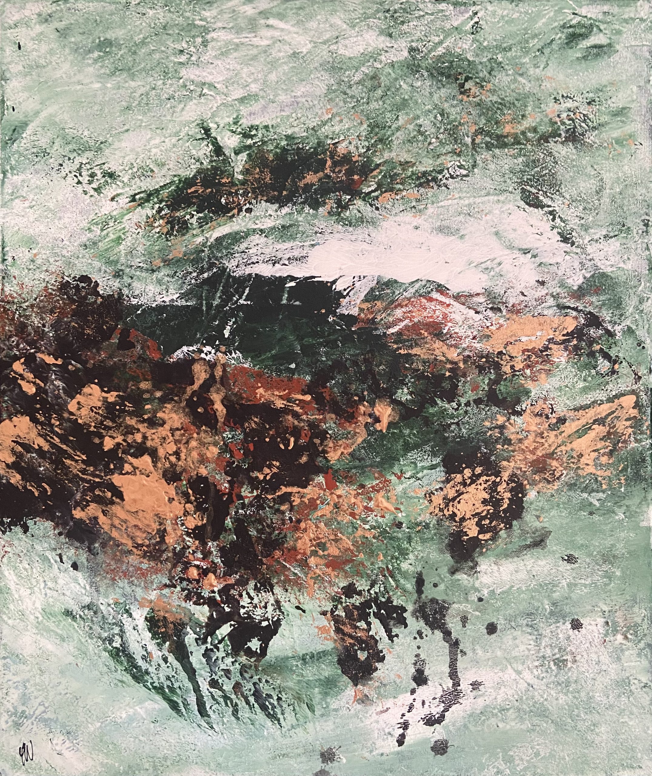Awaken by Carrie Welsh is a beautifully textured abstract piece with metallic accents that will bring life to any room. 60 x 50 cm. Acrylic on canvas, ready to hang. Frame not included.