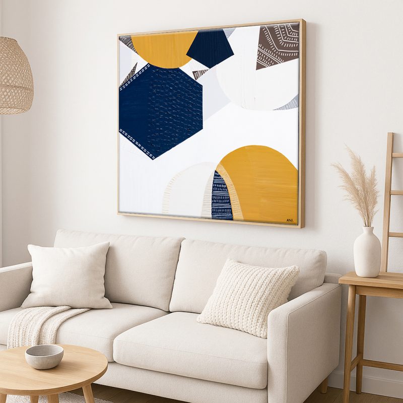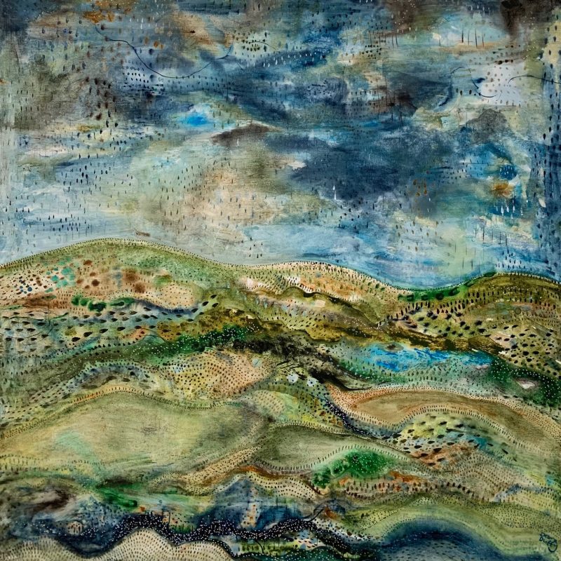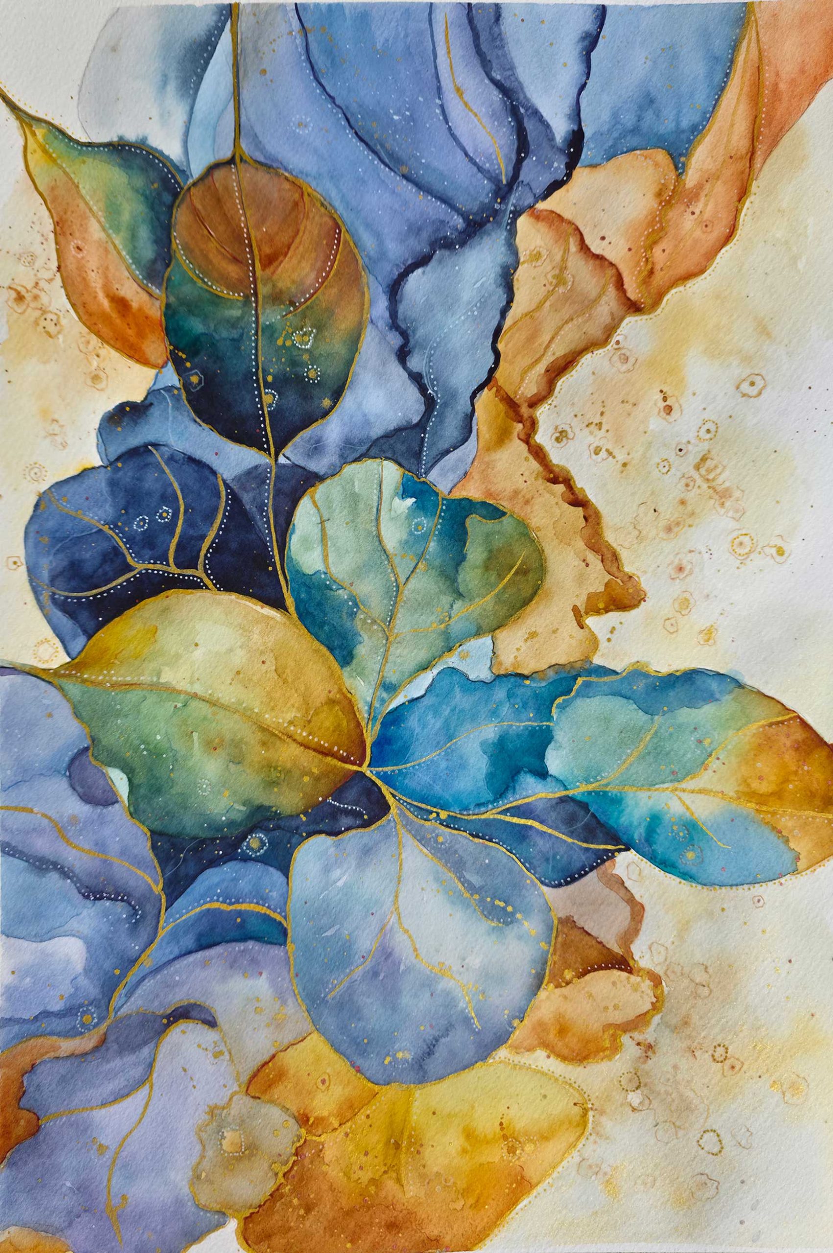 Awakened Stillness by Kay Shanley captures the delicate tension between quiet reflection and vibrant energy. Layers of translucent watercolour flow like emotion—deep blues, warm ochres, and luminous greens—forming abstract leaves that seem to hover between worlds. Fine gold line work adds a sense of reverence and movement, suggesting growth beneath the surface. This piece speaks to moments of calm where transformation begins, a gentle unfolding of strength and beauty from within.
