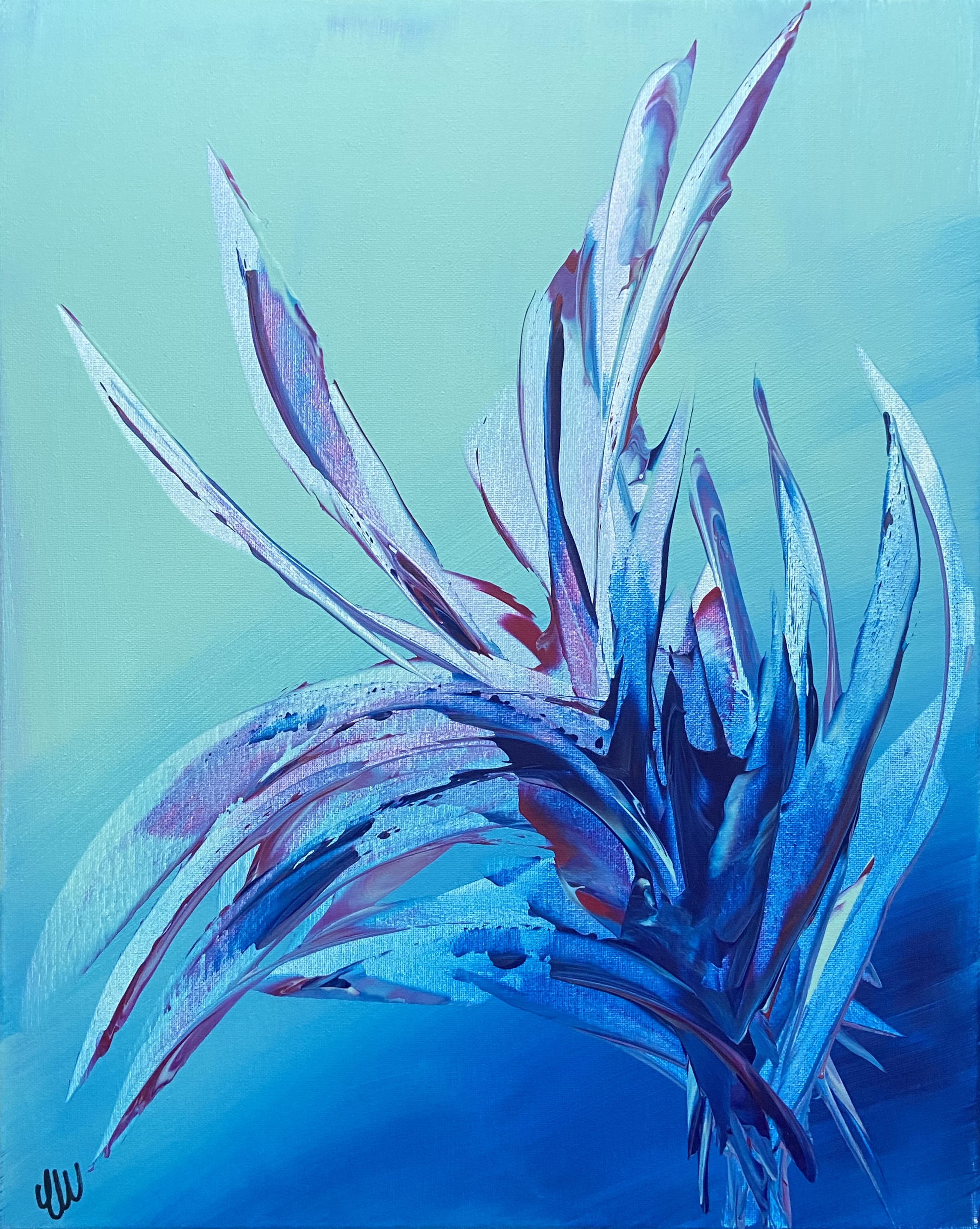 Azure Bloom has a tropical feel with bright colours to liven up any room. Acrylic on canvas. Ready to hang.