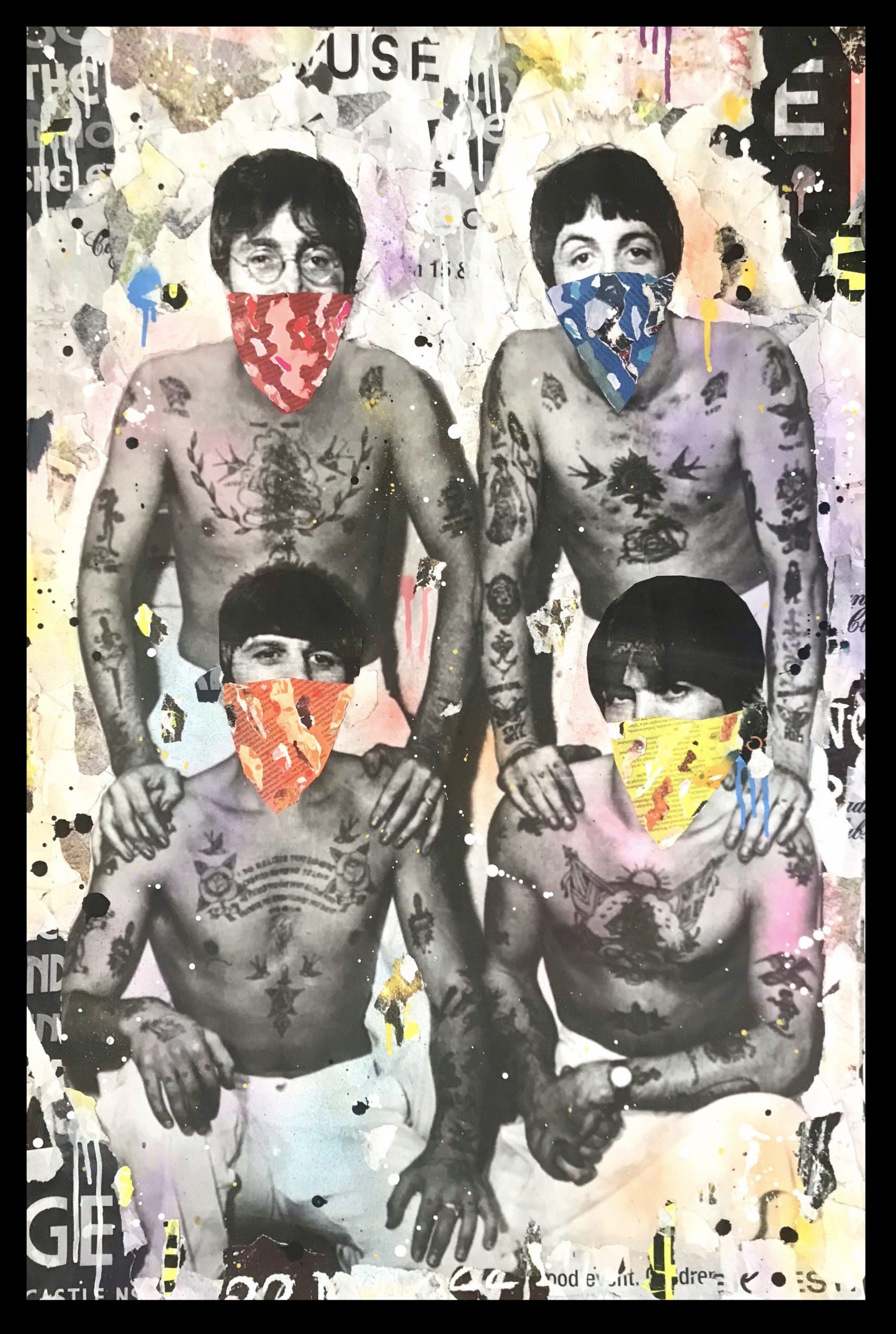 “Then the main Image of The Beatles collaged with a Vintage Tattoo Expo photo was then added and given a rustic appearance with further Paint and Paper.”