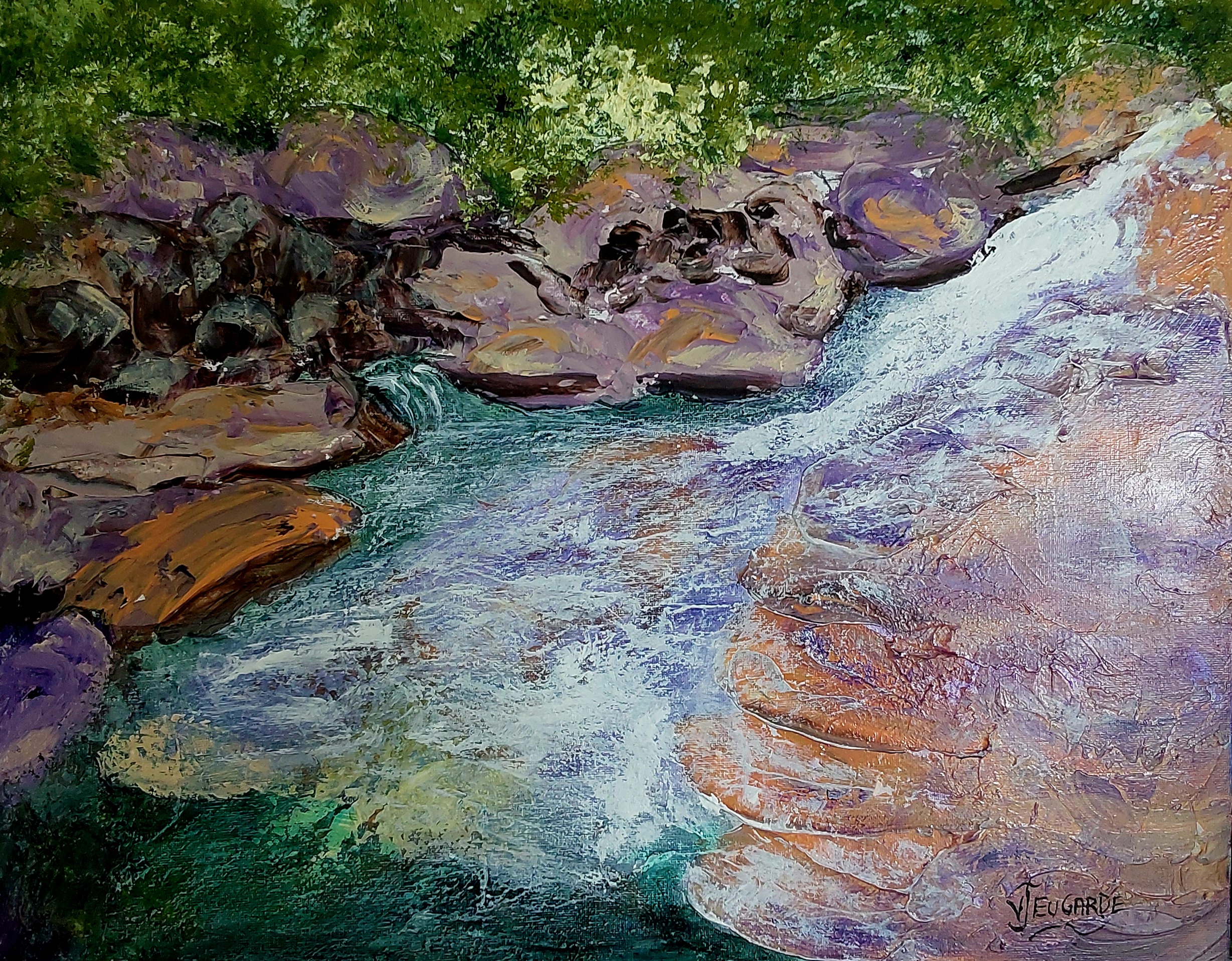 Babinda Boulders by Valerie Eugarde:- my impression of one of the most beautiful spots in Queensland, i have only been there once a very long time ago but still hold those memories, the energy of the water and the surrounding boukders are just magical, i hope you like my interpretation. I have used texture, quality acrylic paints and many transparent glazes.