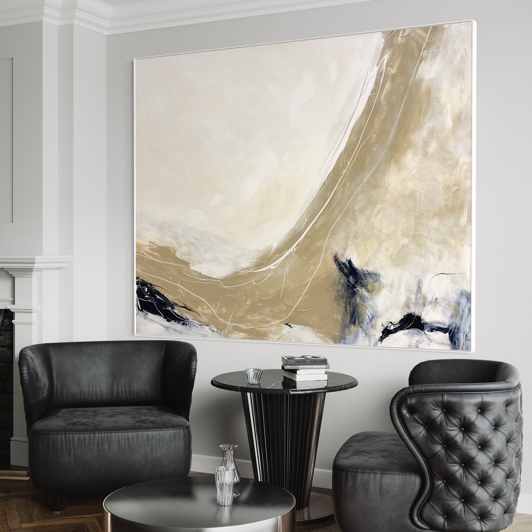 Back Of Beyond is a beautiful statement painting perfect for the home or office. Its soft neutral palette of white and warm beige, against dark blue, black and grey will come alive in any space.