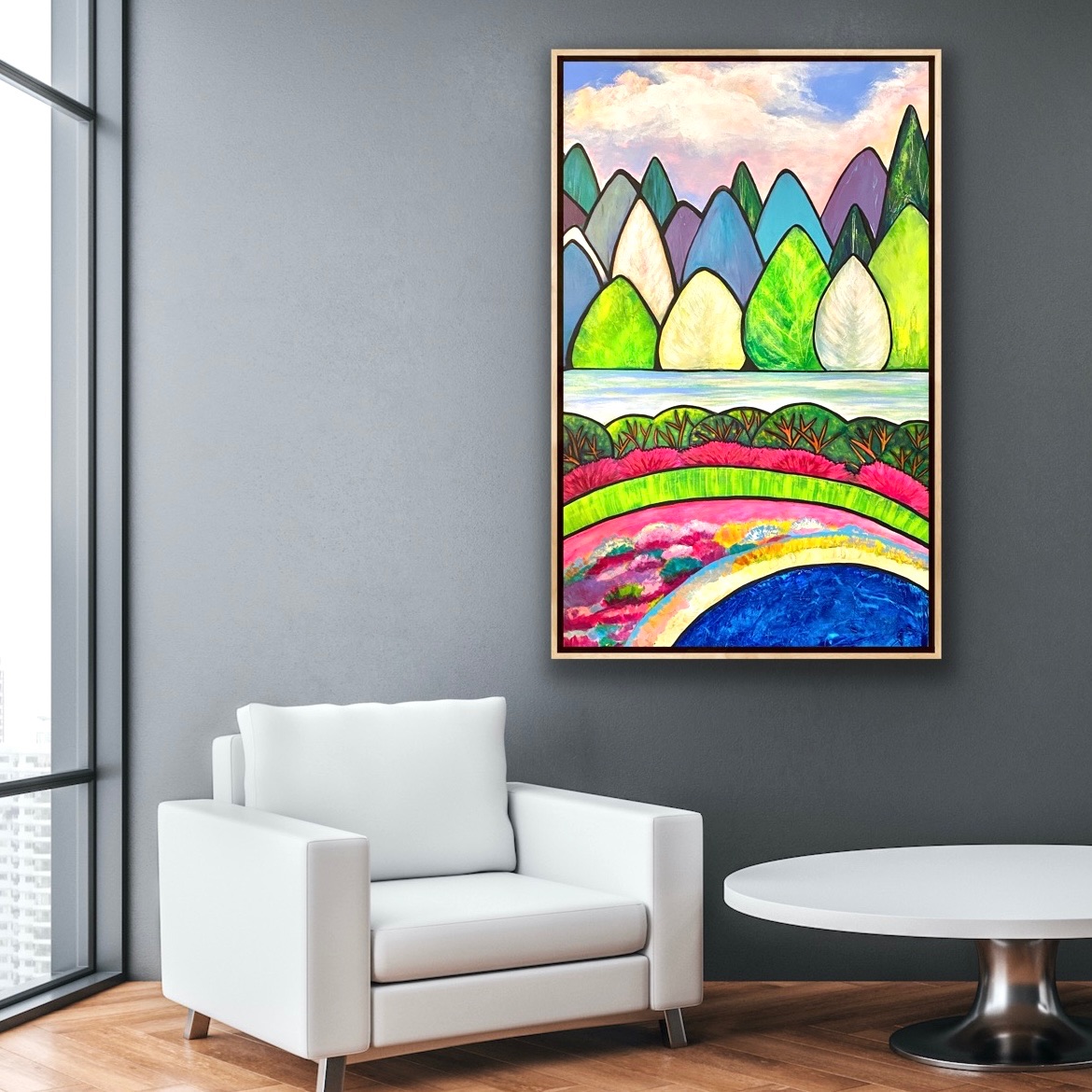 A lovely large modern landscape to capture the feel and the colours of those beautiful country gardens that are open to the public at certain times of year throughout Australia. I’ve visited many of them and wandered through extensive winding paths to dams, old pine tree stands and sunlight filtered garden beds full of native flowers and shrubs. This original painting was inspired by those gardens.