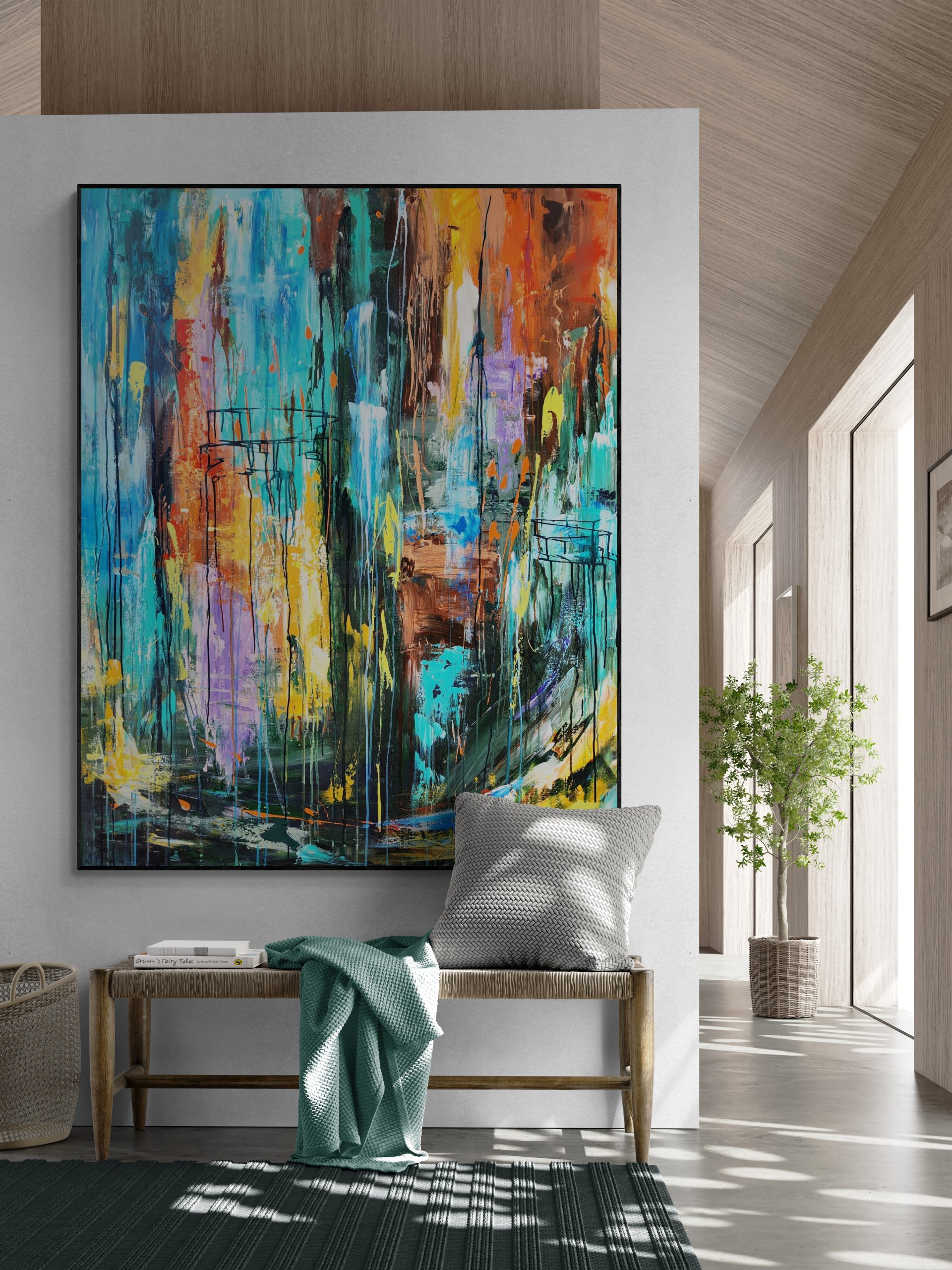 This beautiful modern piece is made with lots of layers of texture and drips of acrylic paint.