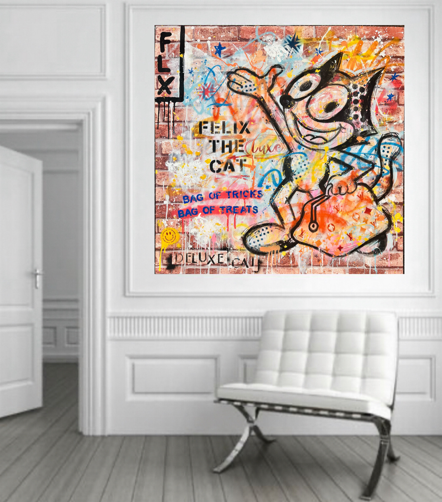 This original Artwork features Felix the cat, & is a continuation of my current series, playfully mixing vintage cartoons with modern reality.