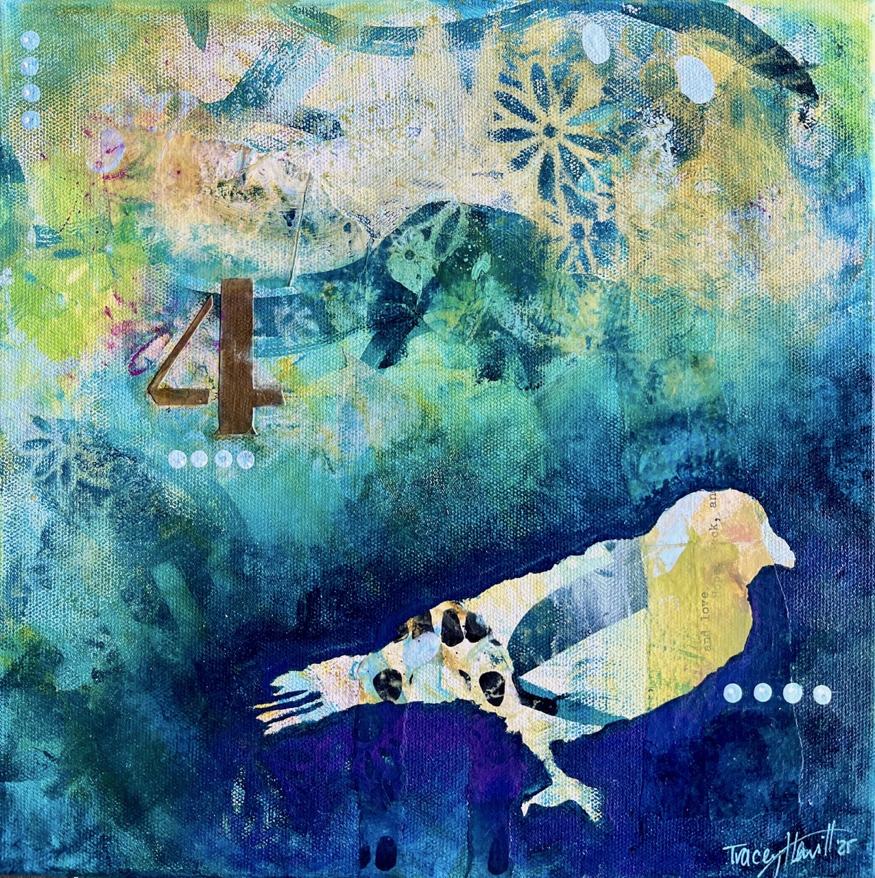 There’s layers of ephemera, symbol, and meaning woven into these pieces – including telegram fragments, old letters, birds and the numeral 4.