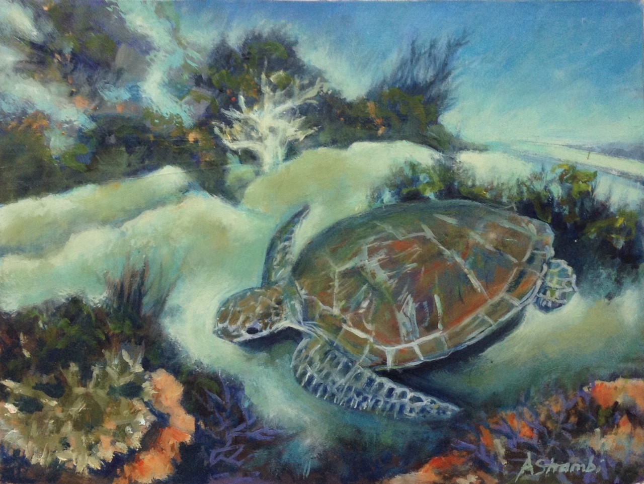 This artwork is inspired by a recent visit to northern Bali where the coral and marine life draws many visitors to try snorkelling and scuba diving. Turtles are beautiful and gentle creatures and are often depicted in art, and I wanted to paint this subject and celebrate the underwater world.