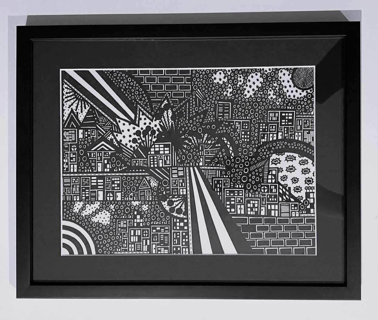 Balls on sticks by Misty-Spring Grant – Framed original black and white archival ink drawing.