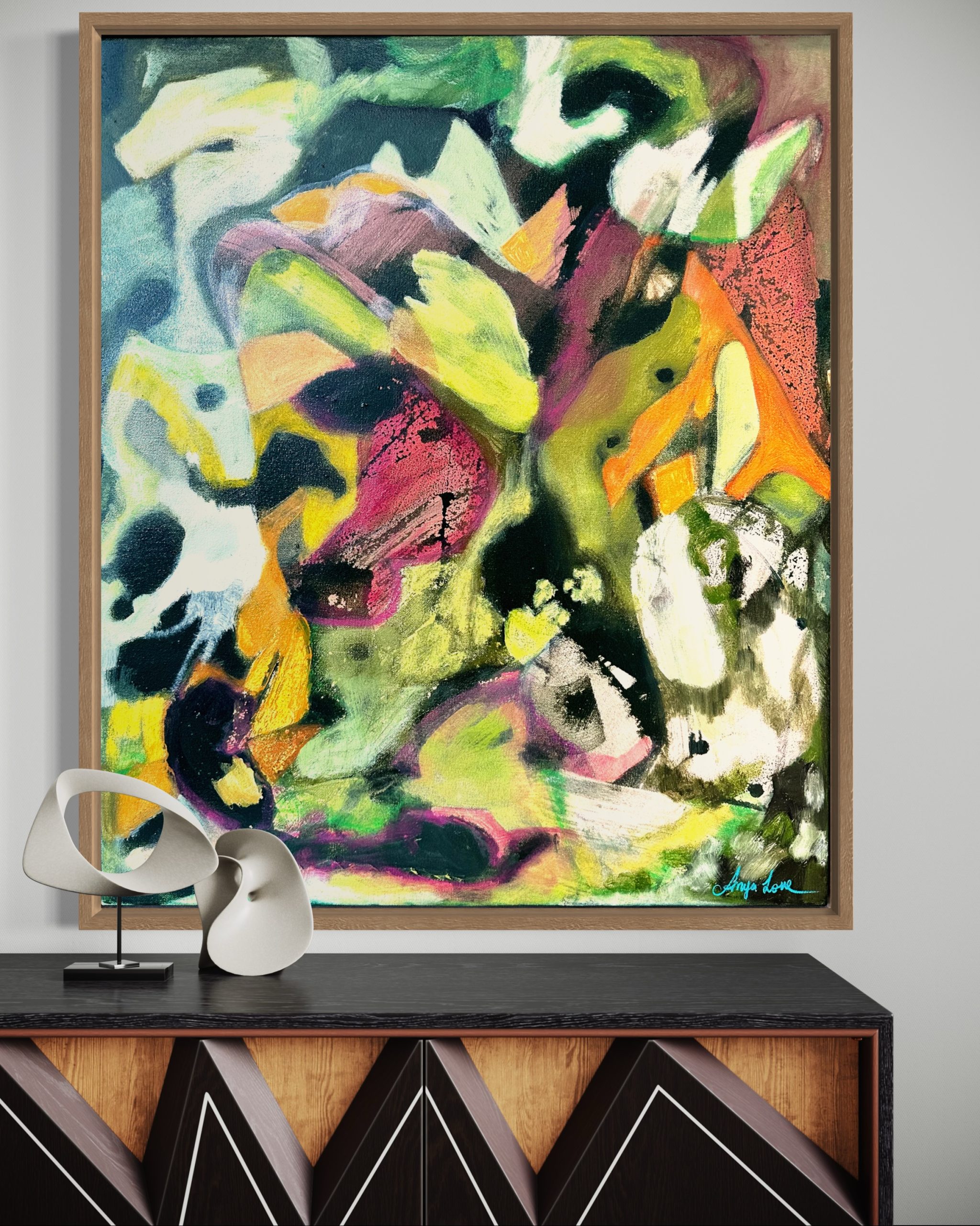 Original artwork. Oil paint & oil sticks on stretched canvas FRAMED in an oak gallery shadow box frame. 61cm x 51cm.