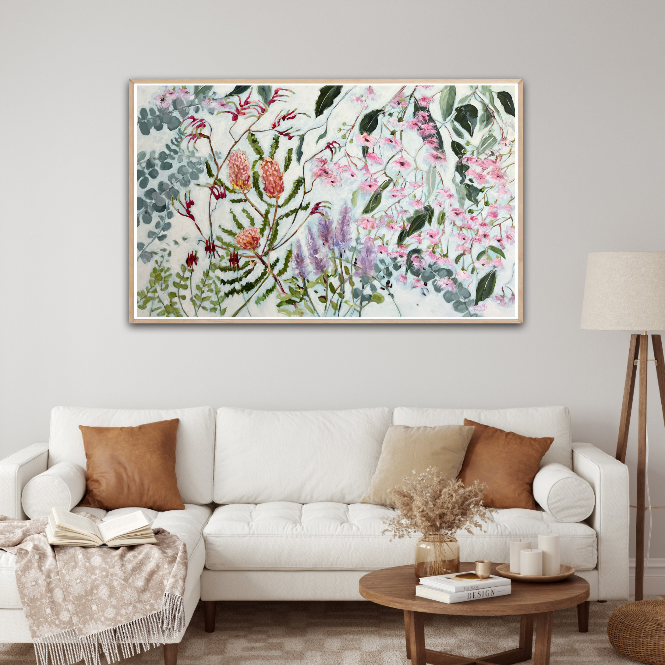 Banksia 2 by Meredith Howse is an original painting that showcases a harmonious collection of Australian native flowers in full bloom. The artwork features an array of vibrant flora including Banksia, Gum Nut Eucalyptus, Sturt Desert Pea, and Kangaroo Paw, which is the state flower emblem of Western Australia. Each element is thoughtfully depicted, celebrating the natural beauty and diversity of Australia’s flora.