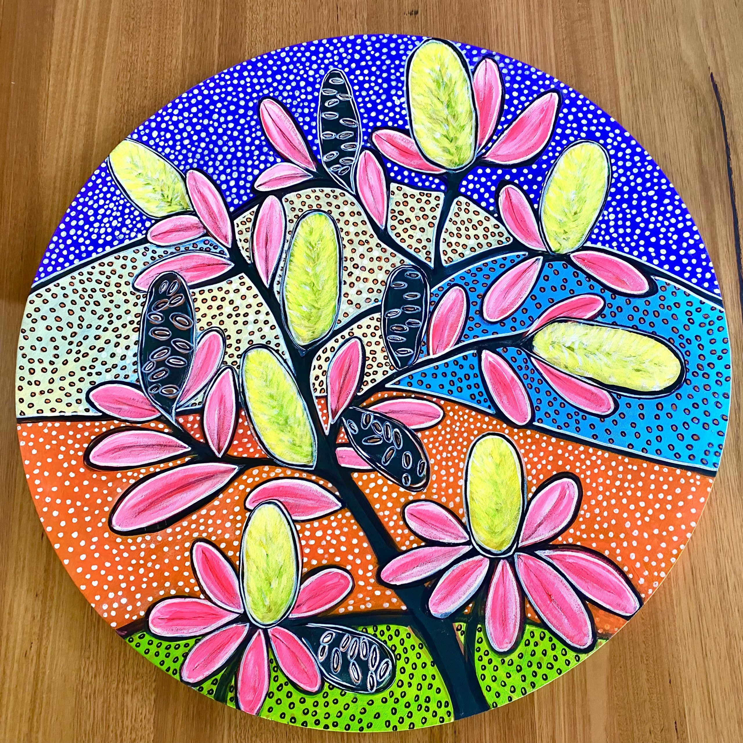 Banksia flowers with a vibrant, stylised twist to add a holiday, coastal feel to a room. Just a little bit special because of the round canvas, especially created to compliment the modern trend of round mirrors and coffee tables.