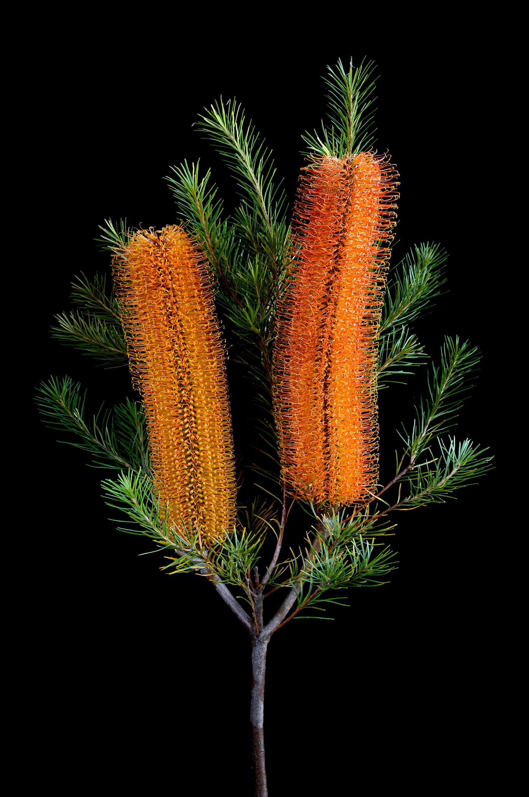 In the midst of a cold grey Winter, Banksia flowers are blooming in burnt orange with gorgeous deep green foliage.