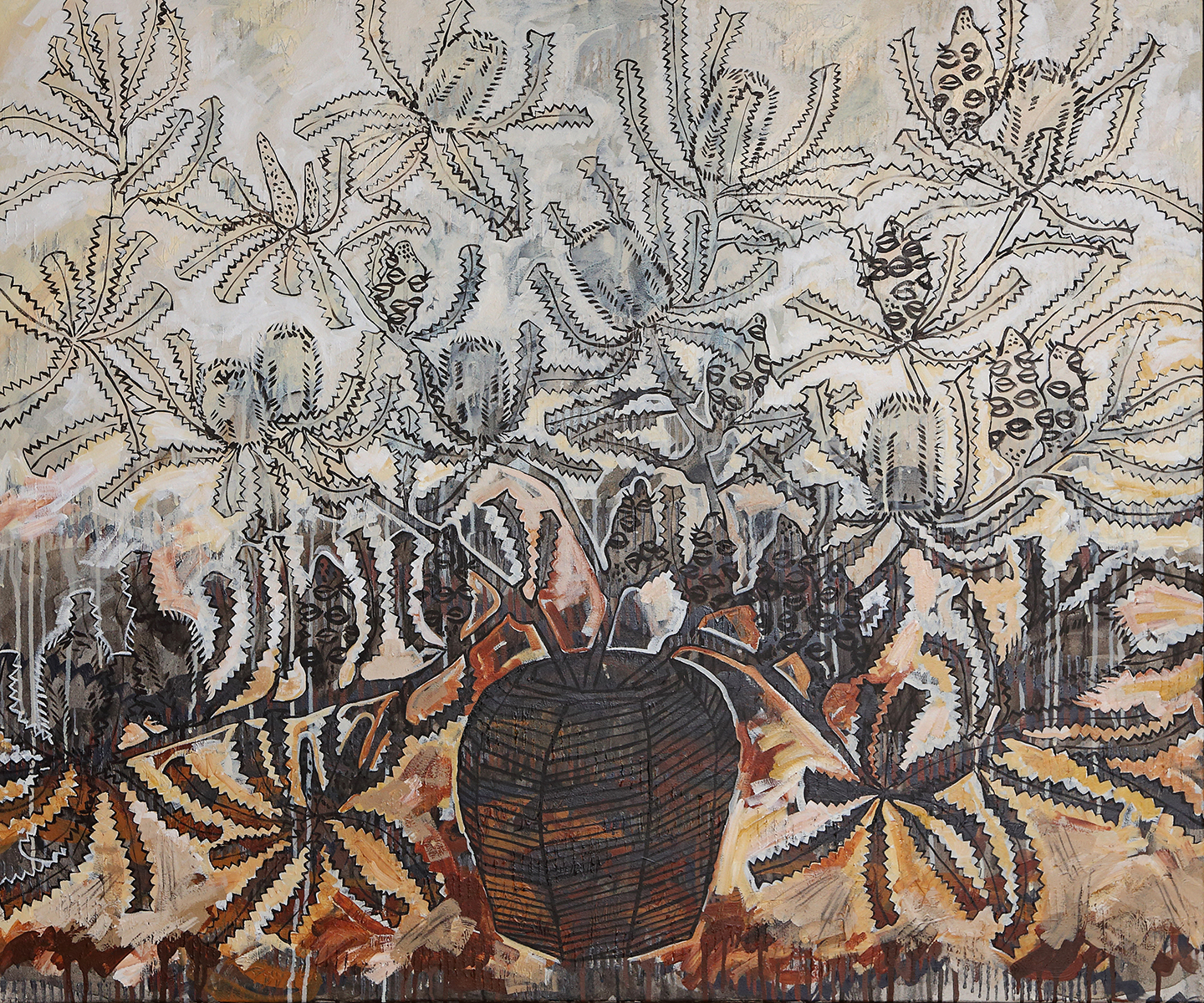 Banksia serrata, also known as saw banksia and old man banksia, can be found along the east coast of Australia from southern Queensland through to Victoria, with small pockets of growth as far south as Tasmania. In this piece, the foliage of the banksia serrata is spilling out from a simple central pot.
