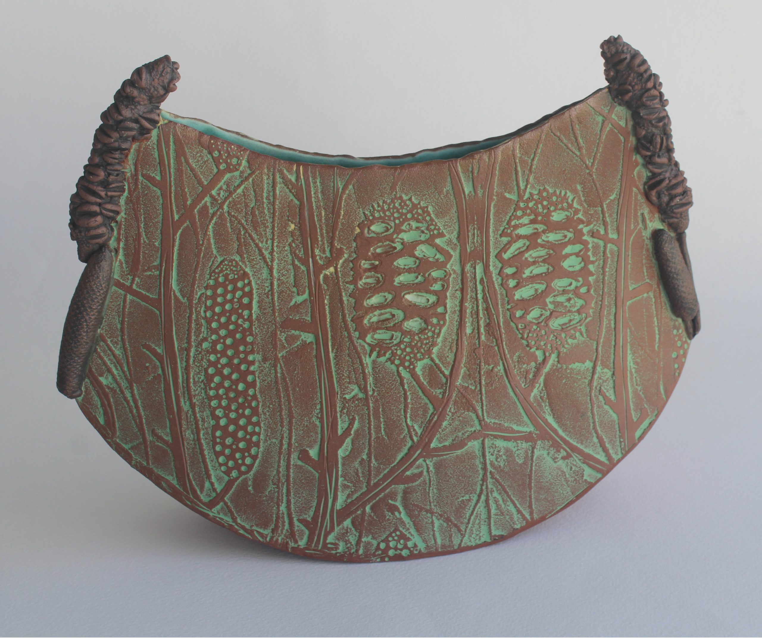 During my many walks along the coastal areas where I live, I am attracted to the bold and strong varieties of the Banksia Tree. The images and objects on this piece depict the woody, sculptural fruiting cone. Although not 100% waterproof, the piece has a small opening in the top to serve as a vessel to display the dried pods of this striking plant.
