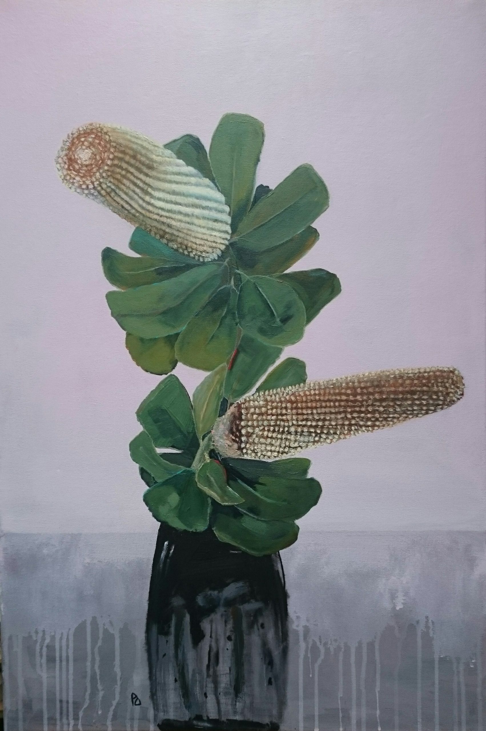 Australian native floral in black vase. Common name Banksia Candle as the shape of this native suggests. I wanted to capture the beautiful long elegant shape which attracted me to paint this native flower with the Australian green broad leaf was delight to paint. Contemporary style in acrylic on canvas framed in moulded wood painted black. In still life format.
