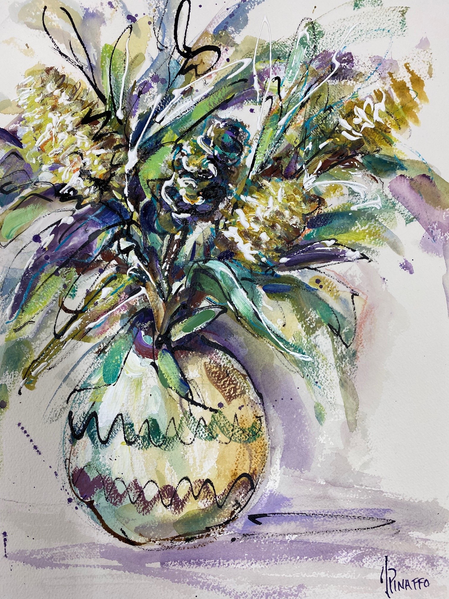 This creation is on watercolor paper using different mediums as watercolors, inks and acrylics.