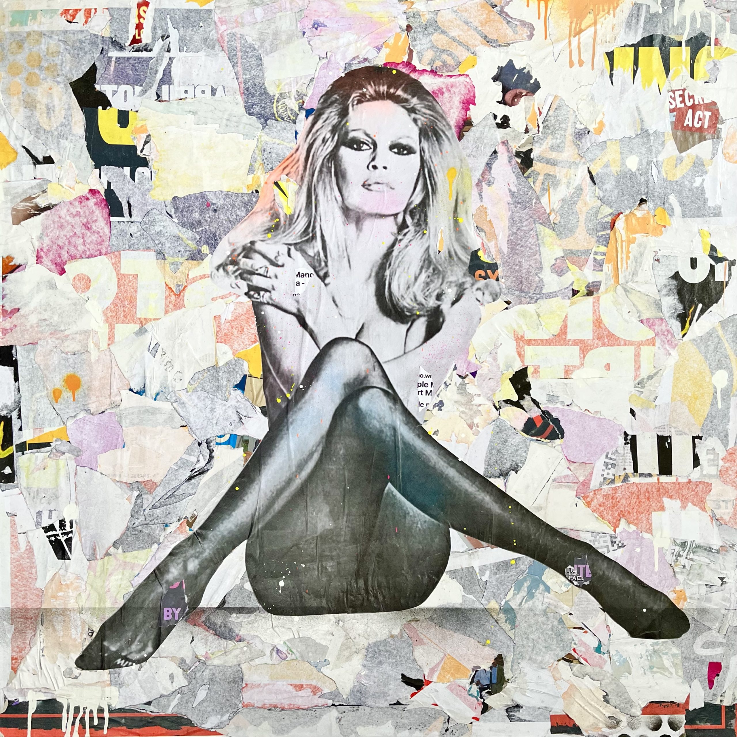 The main image of Bardot was added to the collage and layered with paper and paint. The work comes on a stretched canvas painted black around the edges and is ready to hang.