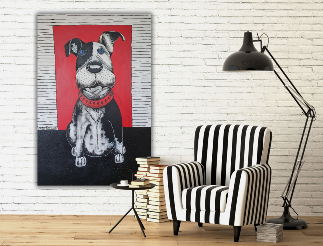 Barker by Mandy Jackson is a large Acrylic and Mixed- media original artwork on stretched canvas and is ready to hang. Modeled on my brothers pup by the same name this has been a fun artwork to create. Barker is sure to brighten any large contemporary wall space. Sealed.