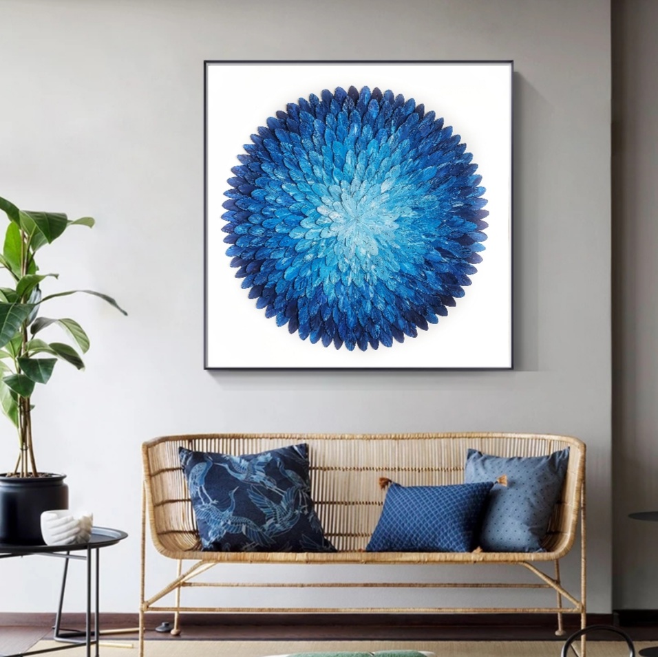 This piece comprises of hundreds of individually crafted, hand cut and hand painted paper feathers that are individually painted with a beautiful high quality acrylic paint. These feathers are then carefully layered on a high quality white canvas to create the unique 3D design.