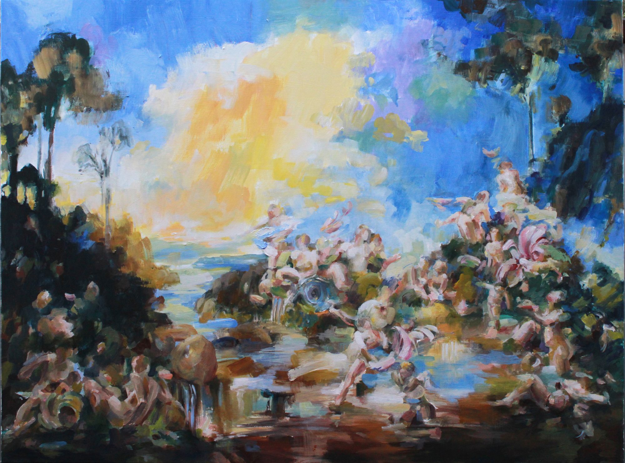 The landscape I have painted as a playground for the figures is an imaginative type of utopia. It is also partly influenced by the many classical allegorical paintings of the 17th and 18th century where there would often be a silhouetted landscape with ethereal skies illuminating a river or stream cutting through the distant landscape behind the figures in the foreground.
