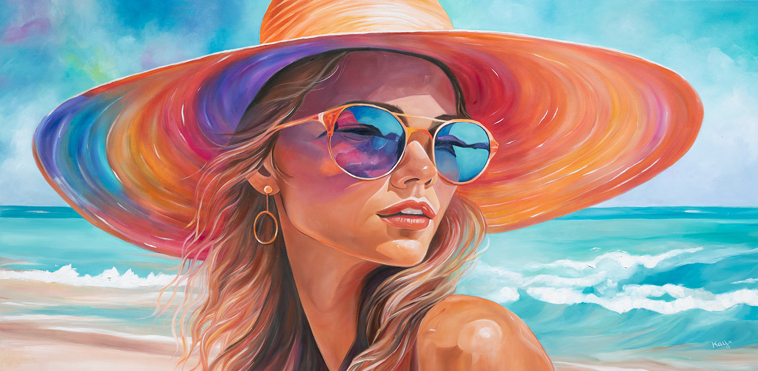 Bay of Fires embraces the spirit of an Australian summer, capturing the essence of carefree days spent at the picturesque Bay of Fires on the East Coast of Tasmania. It portrays a woman basking in the glow of a sunlit ocean, her colourful hat and sunglasses reflecting her vibrant spirit. This painting is a celebration of confidence, freedom, and the joy of embracing life’s beauty. It invites the viewer to feel the warmth of the sun and the endless possibilities of a bright horizon.