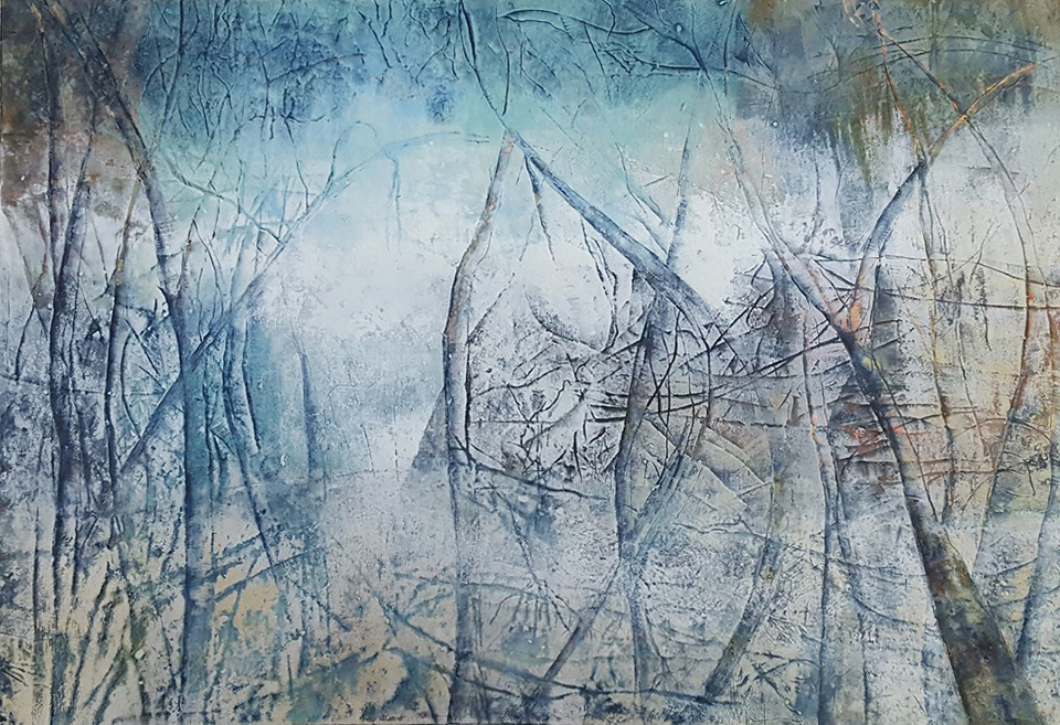 Contemporary painting produced on site during ‘pleinair’ painting on the Sunshine Coast of Queensland. This is a cold wax mixed media painting, capturing the early morning mist rolling out from the woodlands.