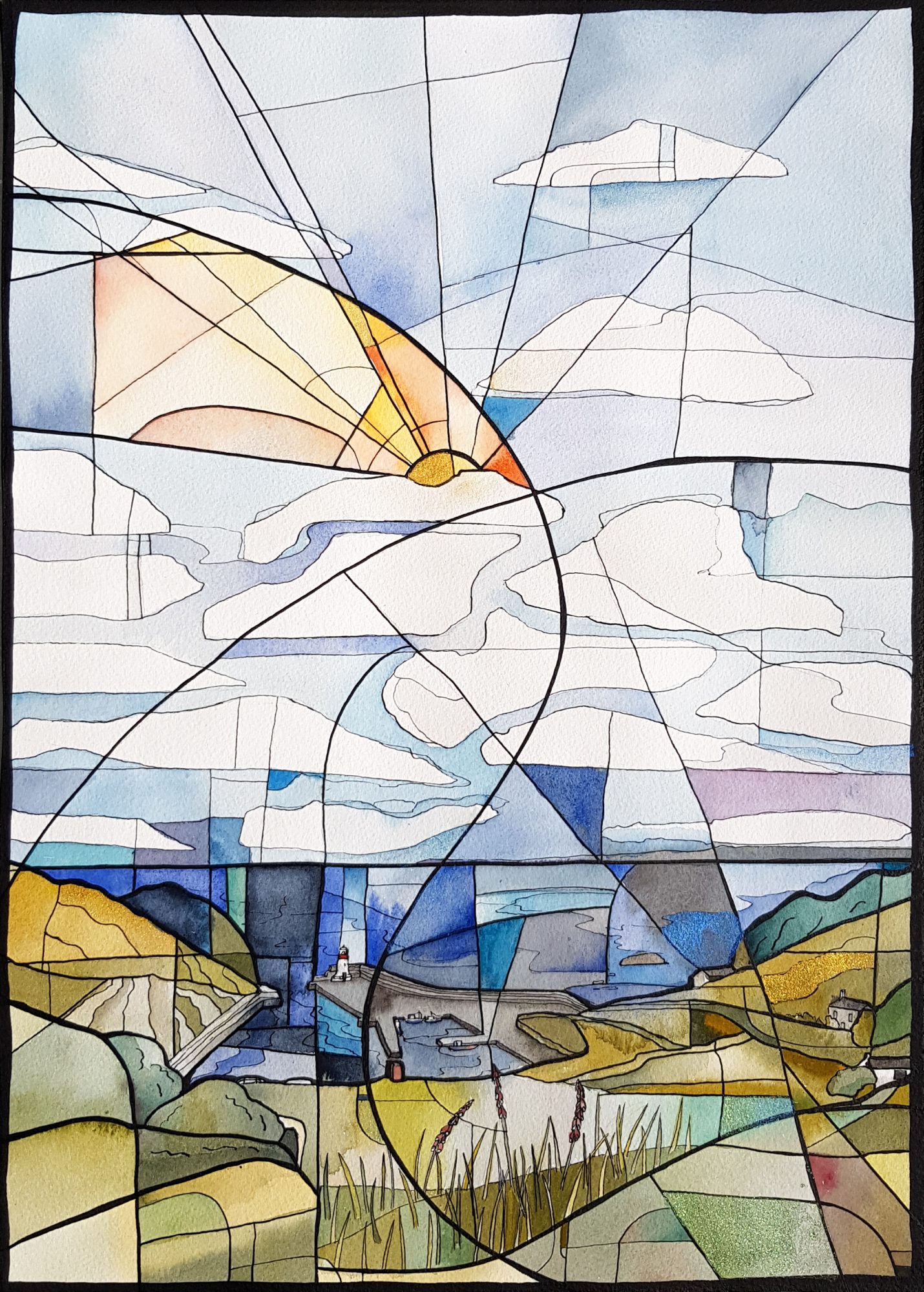 Small shapes are picked out with shimmery watercolours. Loose and layered watercolour washes are held together with black linework giving an effect of stained glass.