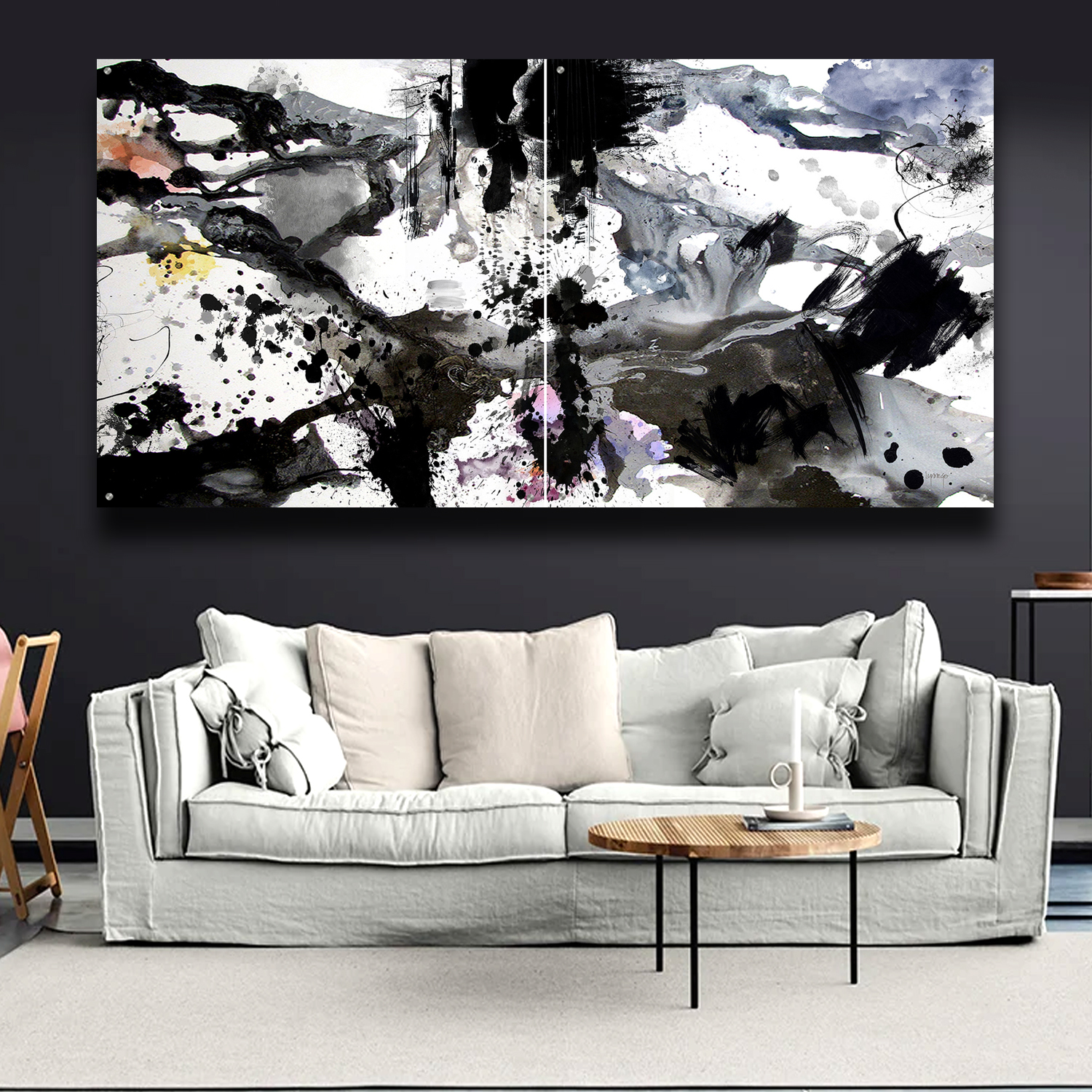 A very large, bold diptych that will wow in any environment. Original abstract artwork, never to be reproduced, printed on UV protected acrylic glass, which allows it to be featured inside or out. Comes with Certificate of Authenticity and instructions to hang. Definitely will not disappoint in person.