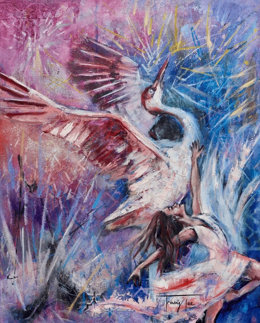 “Be the Fireworks” by Tracy Lee Warusevitane – captures the electrifying energy of self-expression and freedom. A dancer and a graceful crane move in unison, their fluid motions igniting the canvas like bursts of light and colour. The painting embodies the bold, vibrant spirit of embracing your power and shining unapologetically. It’s a celebration of living fully, daring to stand out, and being the spark that lights up the world around you.