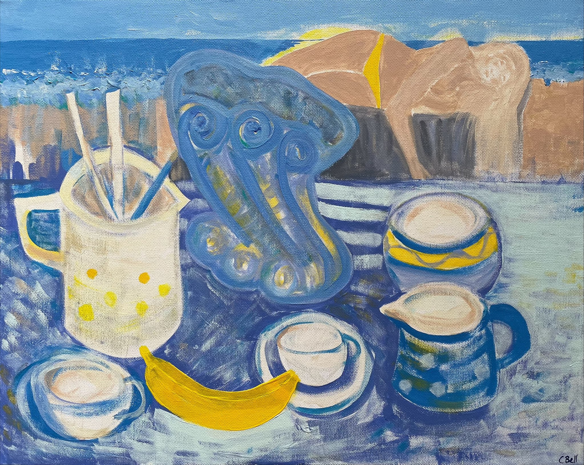 Anticipation of Summer relaxation and fun, inspired me to draw on memories of long ago holidays and beach resorts. My love of collectables prompted me to combine a still life of ceramics with a beachscape. The colours yellow and Blue always remind me of Summer.