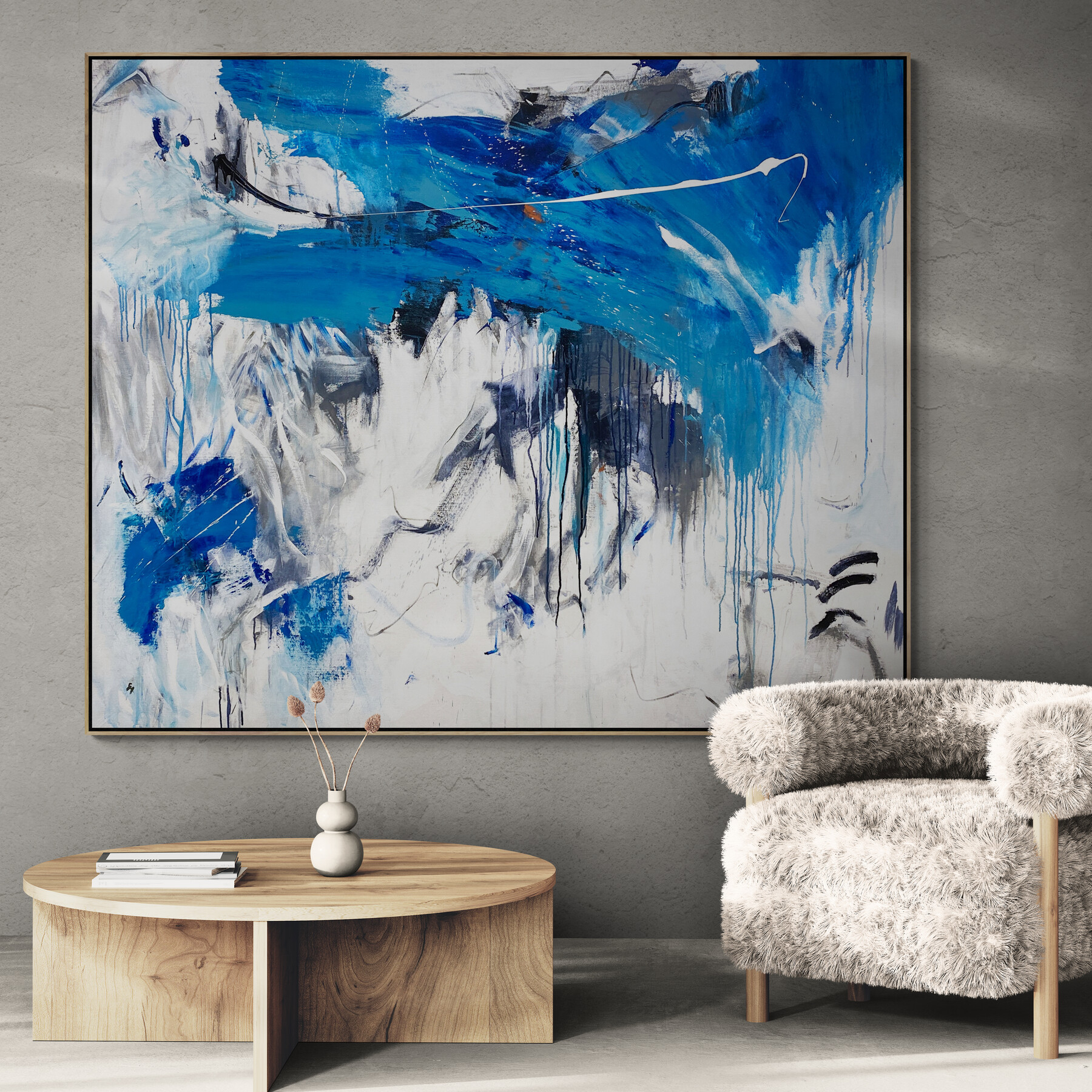 It is acrylic on stretched canvas and comes framed in natural timber.