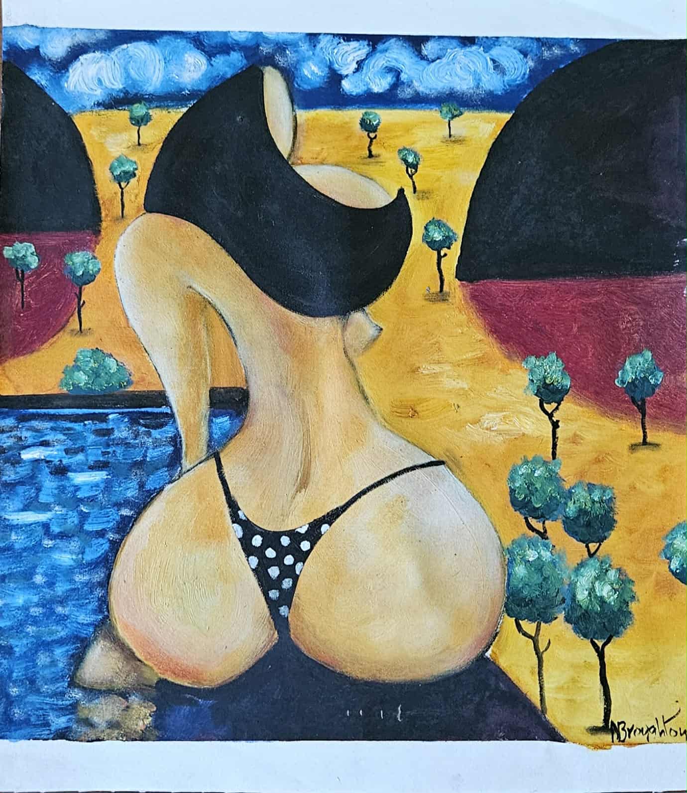 Beach Bum by Nicholas Broughton – A cheeky yet thoughtful take on solitude and sensuality. This stylized figure lounges near water, framed by a surreal landscape of bold colours, swirling clouds, and scattered trees. With exaggerated curves and a polka-dot bikini, the piece invites viewers to reflect on leisure, longing, and the quiet power of being observed from behind.