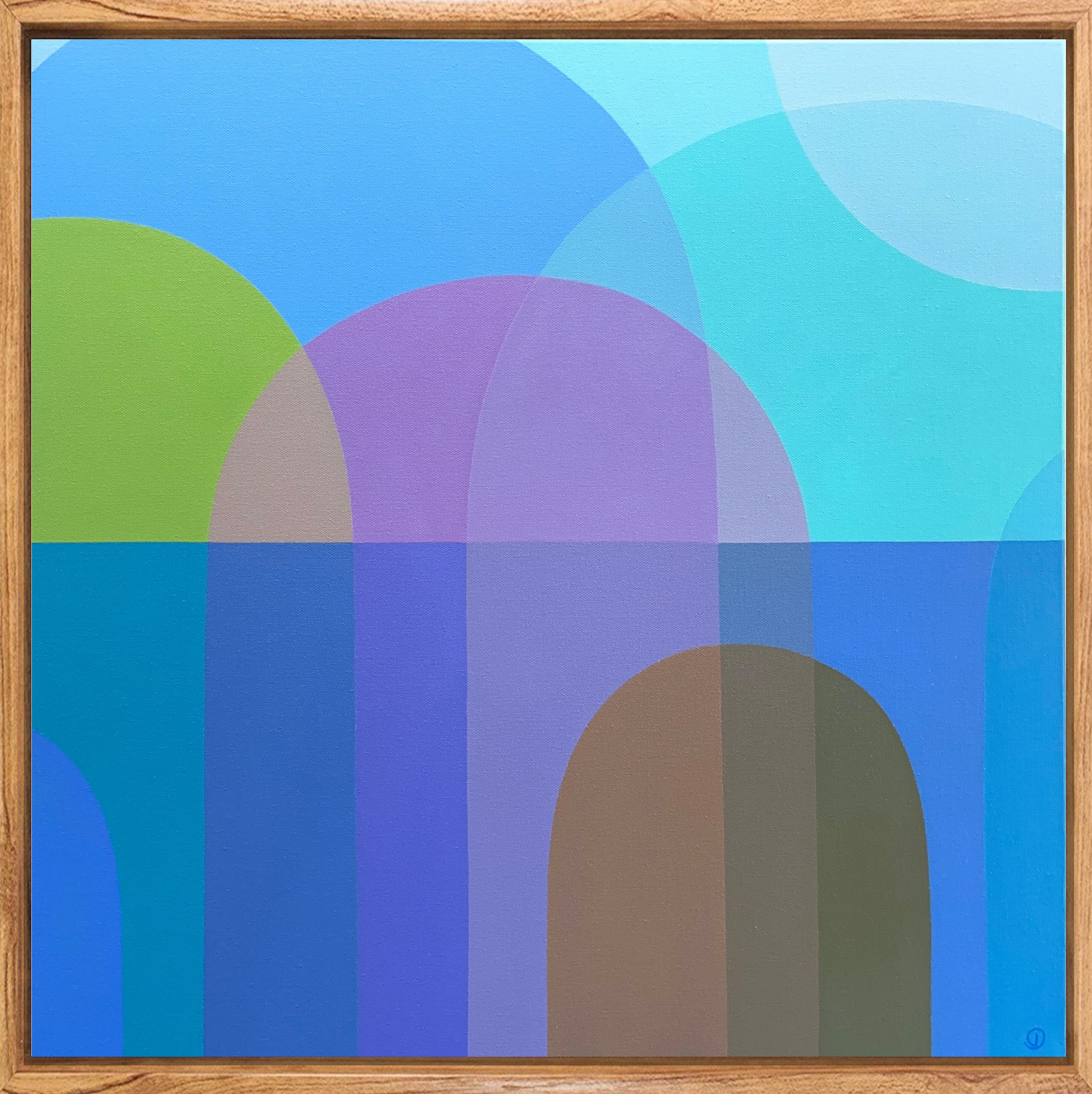 This original abstract painting is inspired by the coastal landscapes of the Victorian Peninsula. Charlotte interprets forms from nature (rainbow arcs, rock formations, seaside horizons, rising tides etc) in a hard-edged style. This painting continues her fascination with layering and juxtaposing vivid colour, experimenting with ideas of transparency and solidity to evoke a sense of joy, light and equilibrium.