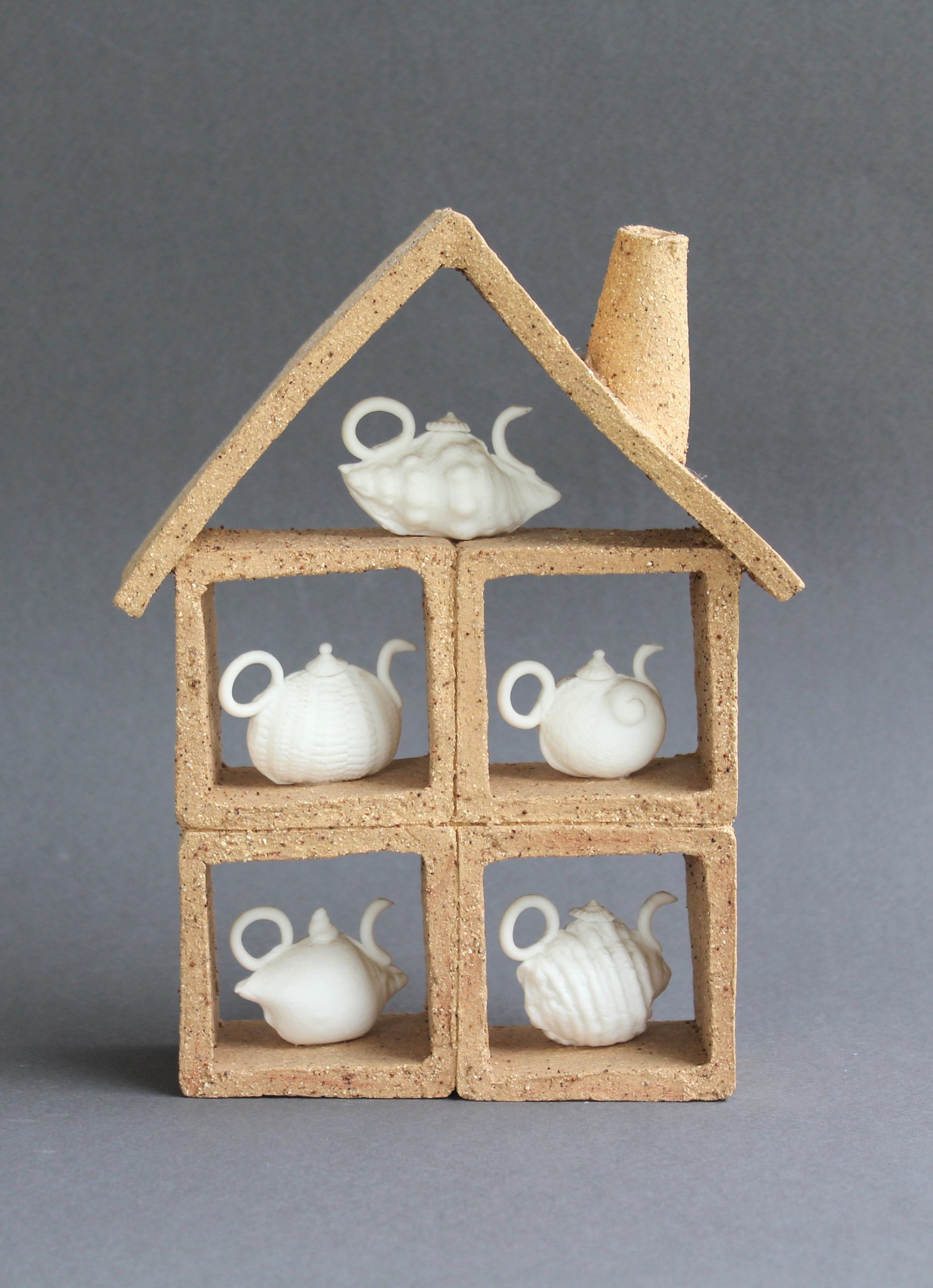 This whimsical set of shell teapots is an original small sculpture. My sense of humour often leads me to make non–functional and comical versions of teapots which play on the function, form, process and place.