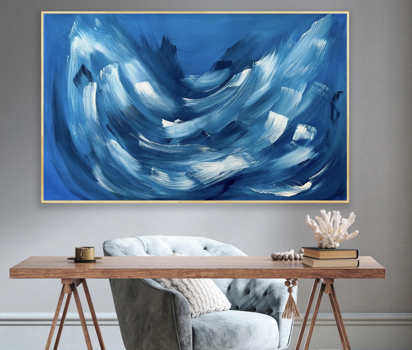 This energetic abstract is made up of many layers of large brushstrokes. It appears to be an organic abstract, although the placement of colour, movement and light is intentional to create the right balance and feeling for your space.