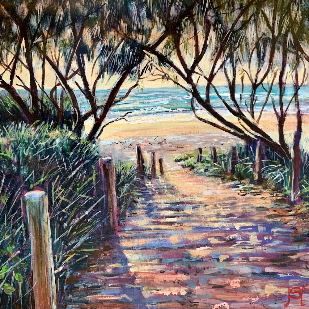 This is an original acrylic painting in a square format.  It is painted on a cradle board and is a typical path with slatted beams covered in sand to the beach that most coastal Australians are familiar with.
