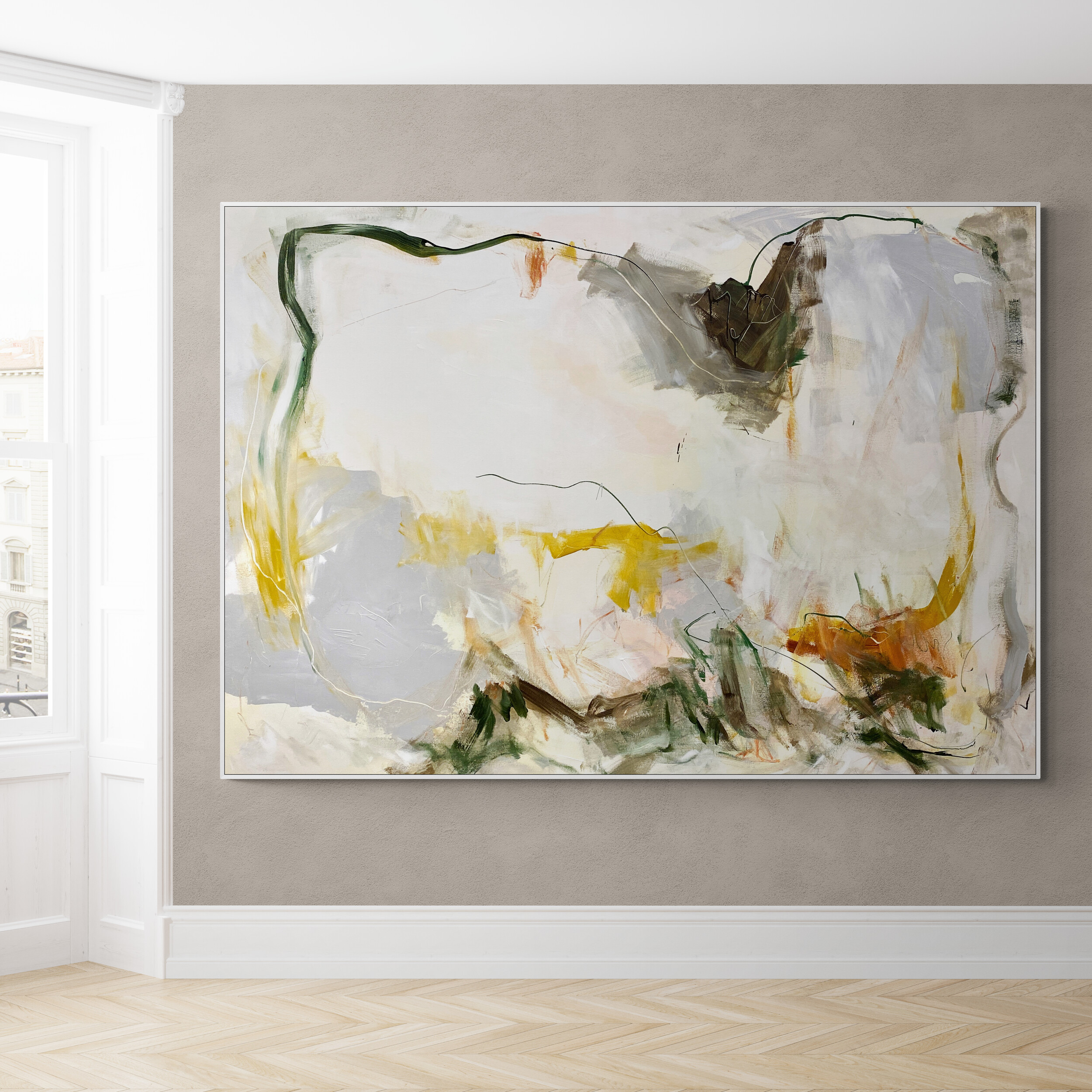Beach Road is a beautiful earthy statement painting perfect for any large space. Its vibrant palette of light warm yellow ochres, beige and browns, green, olive, grey and white makes the mark-making and pencil line work in this piece come alive.