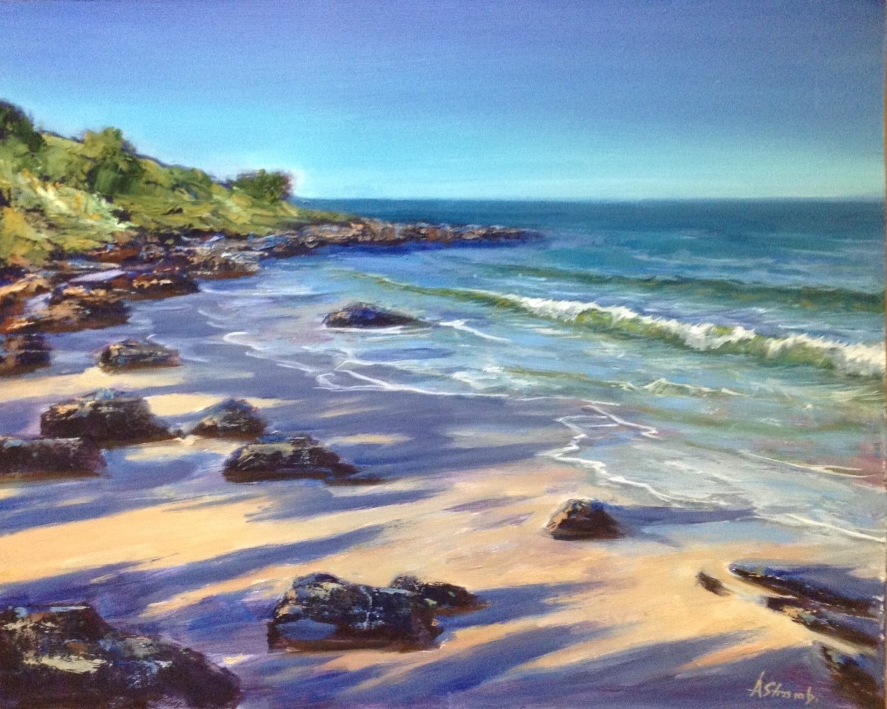Beach Shadows by Anne Strambi – This oil painting was inspired by one of my walks along Pippi Beach at Yamba, where the afternoon shadows fell across the bright sand. I wanted this painting to be loose and impressionist, and used both brush and palette knife to get lots of different effects like texture, patches of colour and random marks. The painting is framed in a lovely oak frame and ready to hang. The frame measures 54 cm x 45 cm.