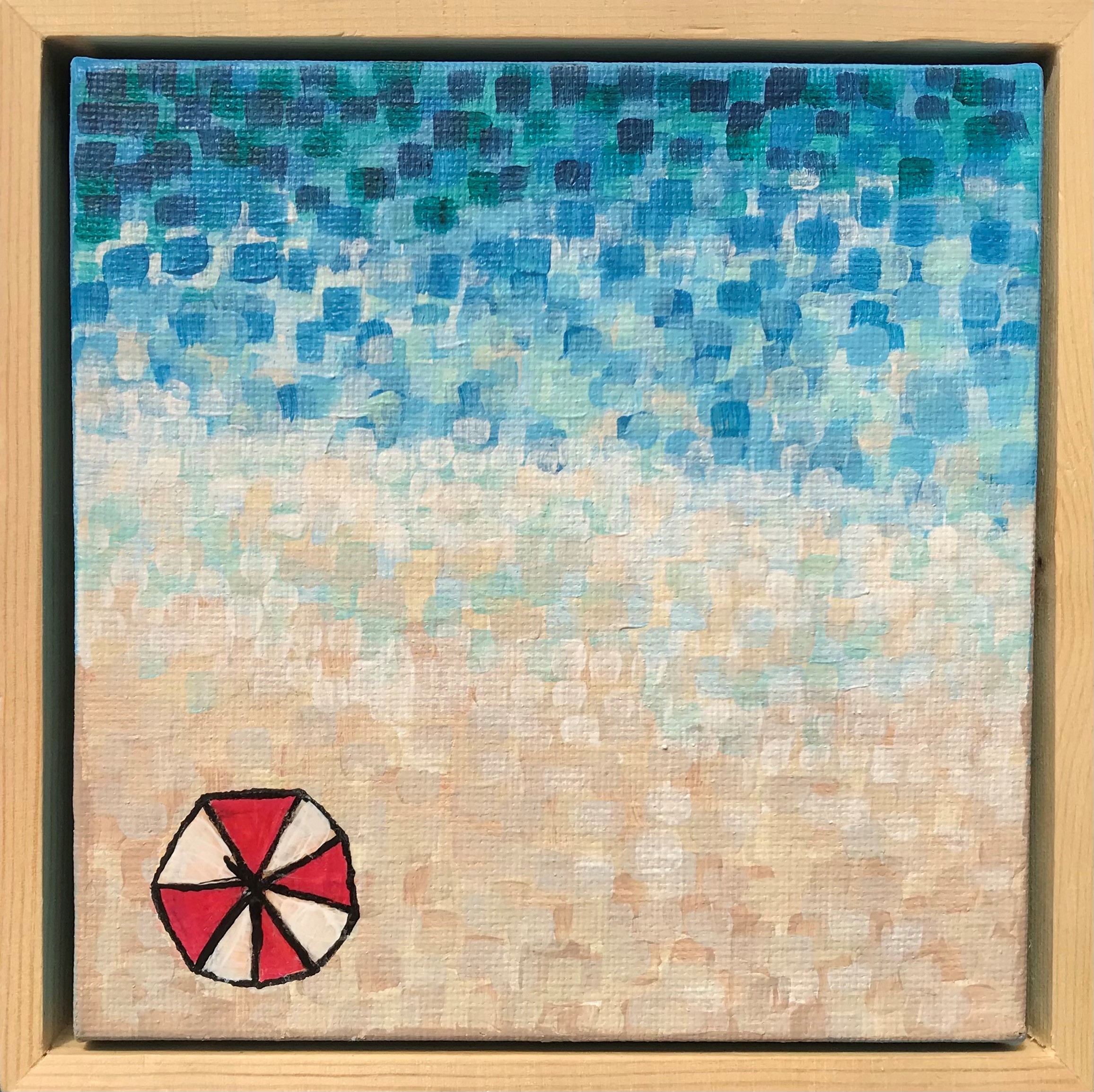 This painting is an abstract painting using square brush strokes. The beach scene with water, waves and sand with a beach umbrella. The umbrella have a gloss coating to make it stand out.