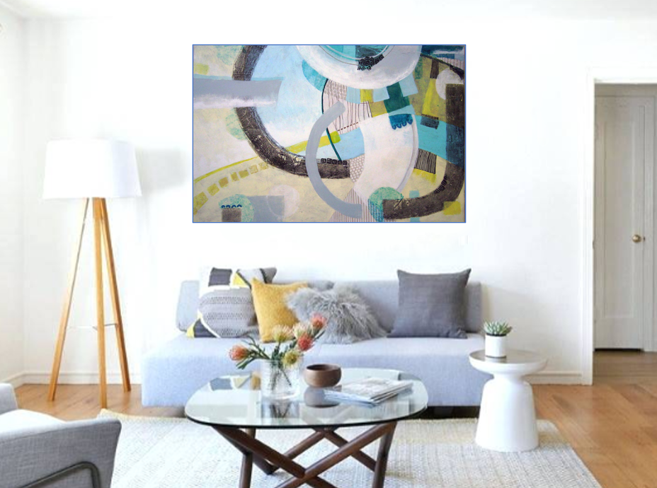 Large swathes of warm yellow and cerulean blue are nterspersed withwhite, grey, black and soft tan. The colours together make a happy mix on the canvas. It art work reminds us of carefree times when we were young. Days spent at the beach surfing and listening to music.