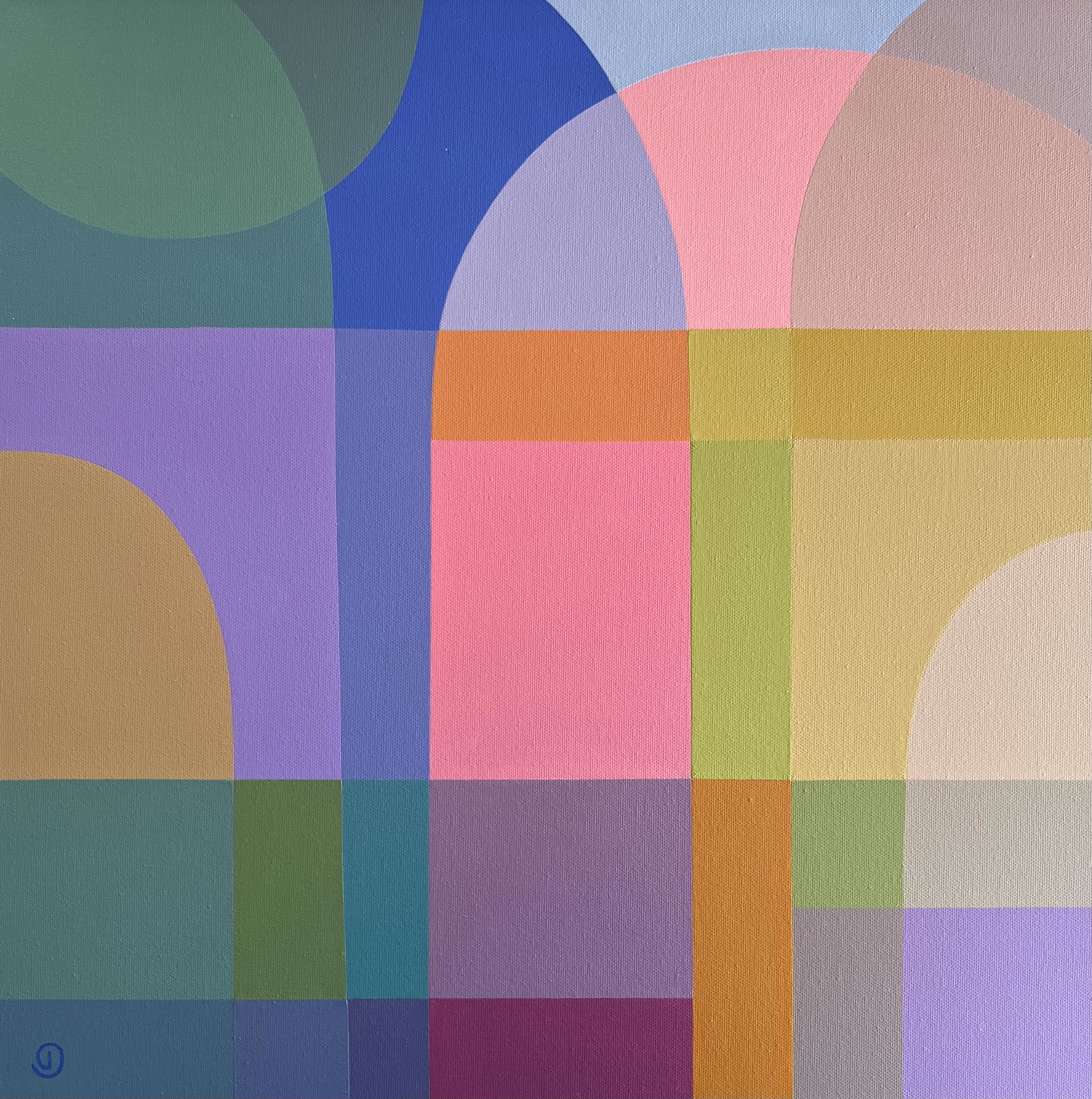 Beach Weekend is inspired by seaside getaways and the calming influence of the ocean and coastal landscapes. The beach environment evokes a sense of escape from the everyday; inhaling salty air, listening to the rhythm of the waves, lying on the sand and dreaming of the endless possibilities the future may hold. Created in Charlotte’s distinctive hard-edge style, this colourful painting draws on physical elements of coastal landscapes (the sea, cliffs, horizon etc) to form an uplifting abstract composition. This work expresses Charlotte’s ongoing fascination with layering and juxtaposing vivid colour to play with opposing ideas of transparency and solidity, simplicity and complexity