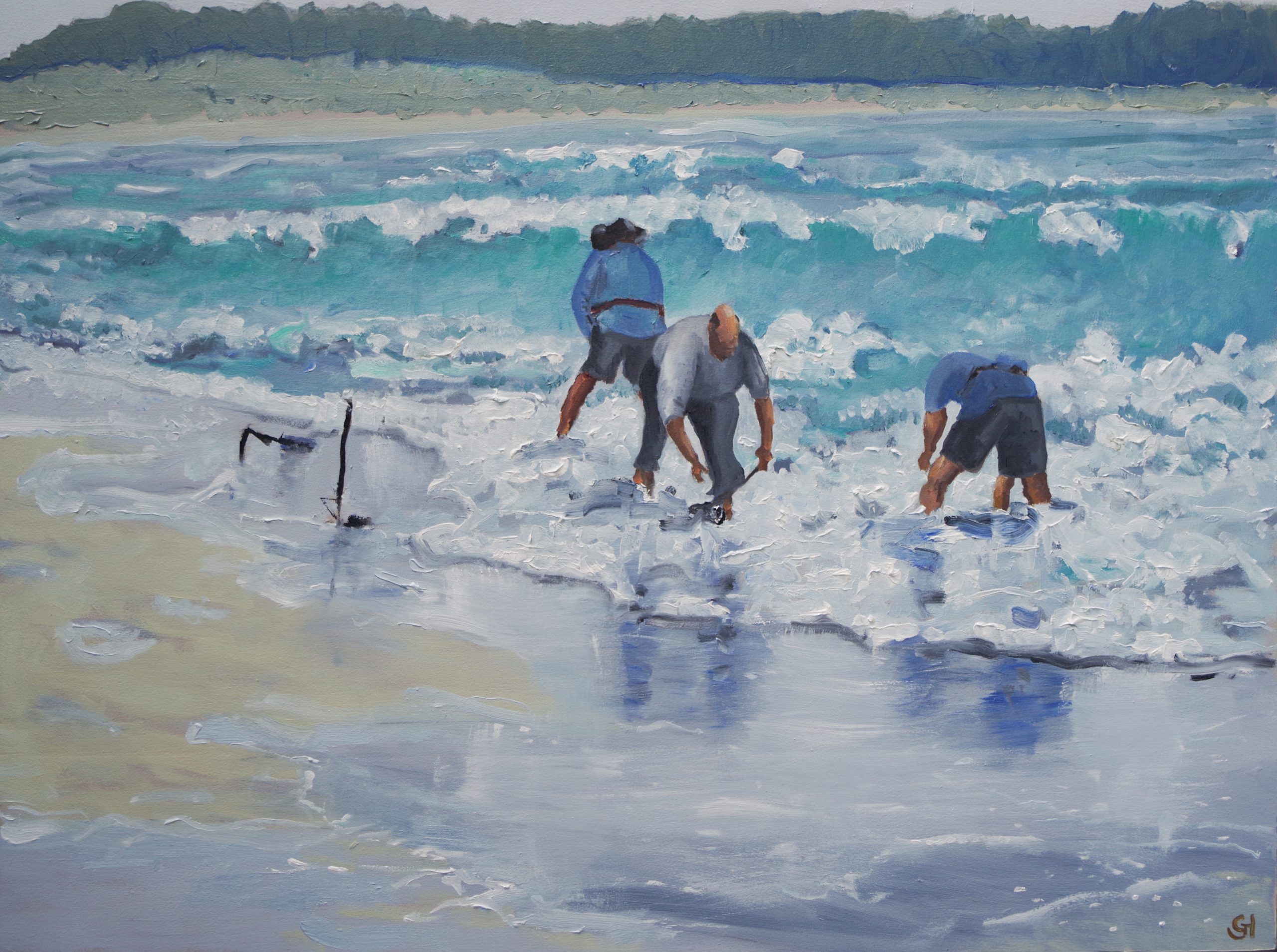 This is a painting of 3 men burlying with old fish carcasses for beach worms.