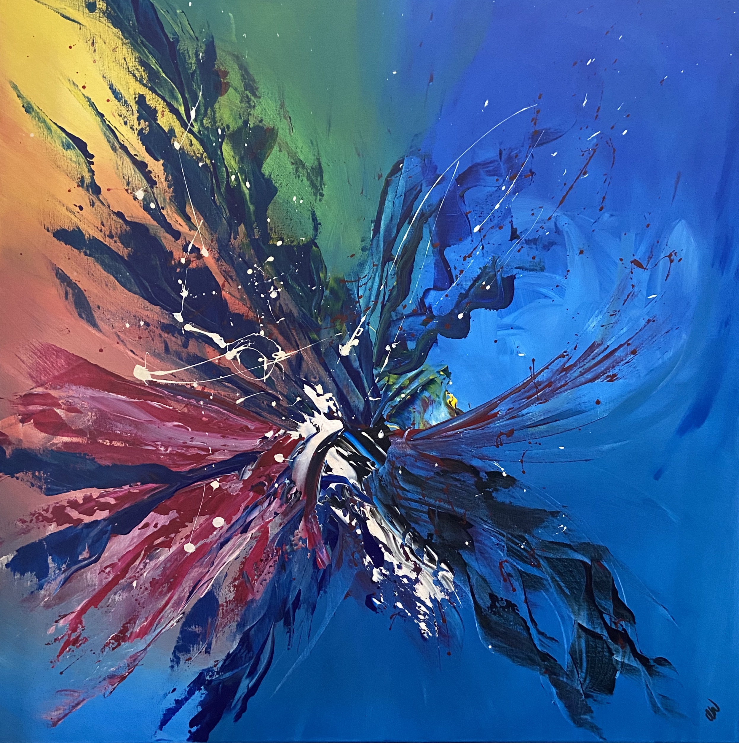 Beaming is a beautifully bright abstract with bold colours and movement. This would look amazing in any area of your home, and brighten up the space. Acrylic on canvas, ready to hang.