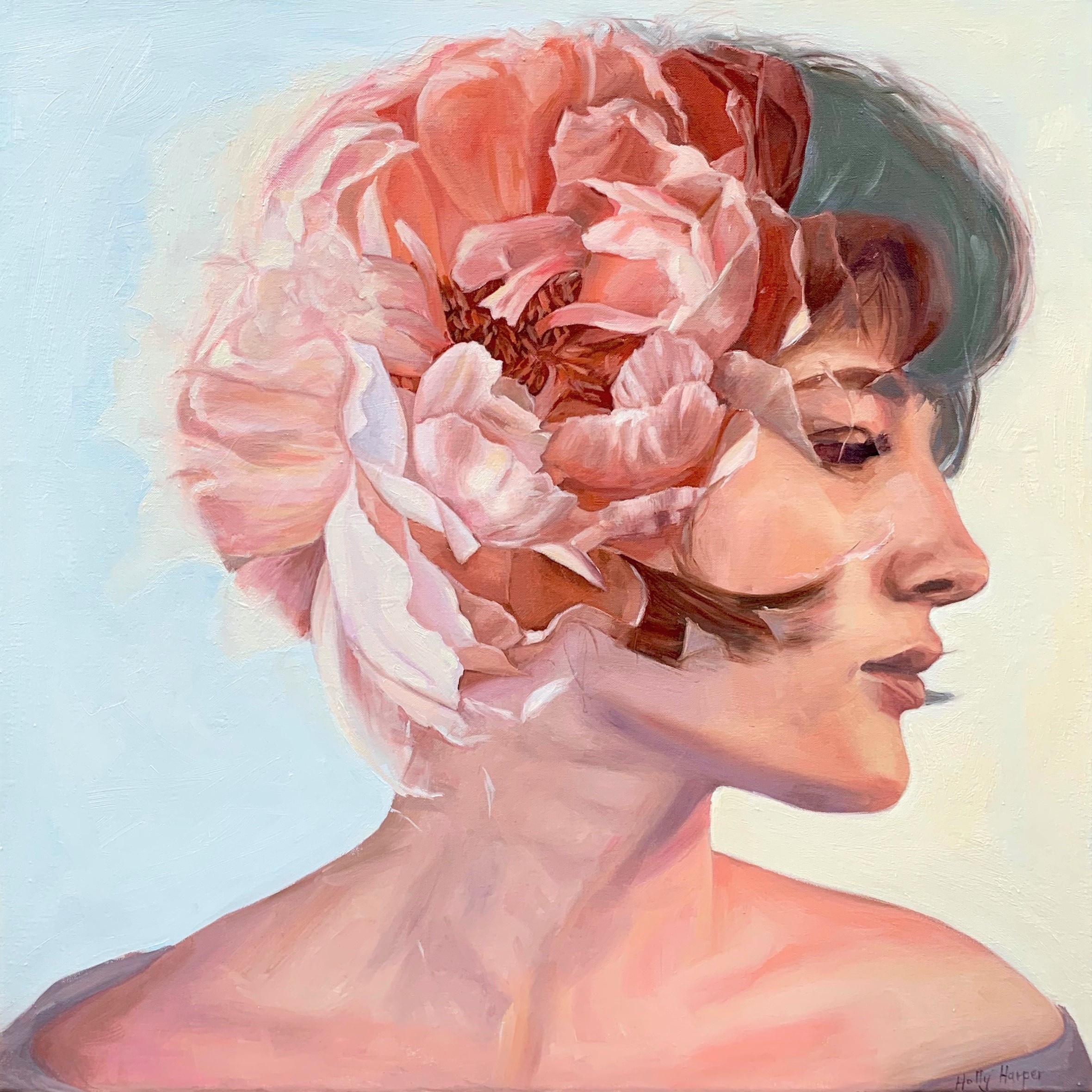 Beautiful Mind – by Holly Harper – This original painting is inspired by the beauty of the mind, influenced by double exposed photographs. The congruency of the images imply the idea that the mind is as beautiful as a peony as it booms and flourishes.