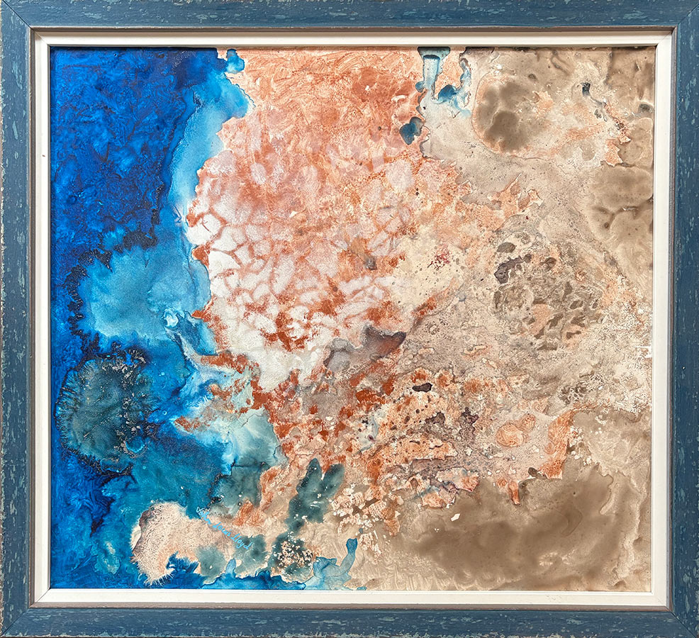 Beautiful Planet v by John Louis Lloyd – abstract artwork in mixed media. This original abstract painting from the Beautiful Planet series of John Louis Lloyd is a painting that was created in mixed media on canvas and has been framed in a retro and rustic blue double frame (has a white inner slip frame).