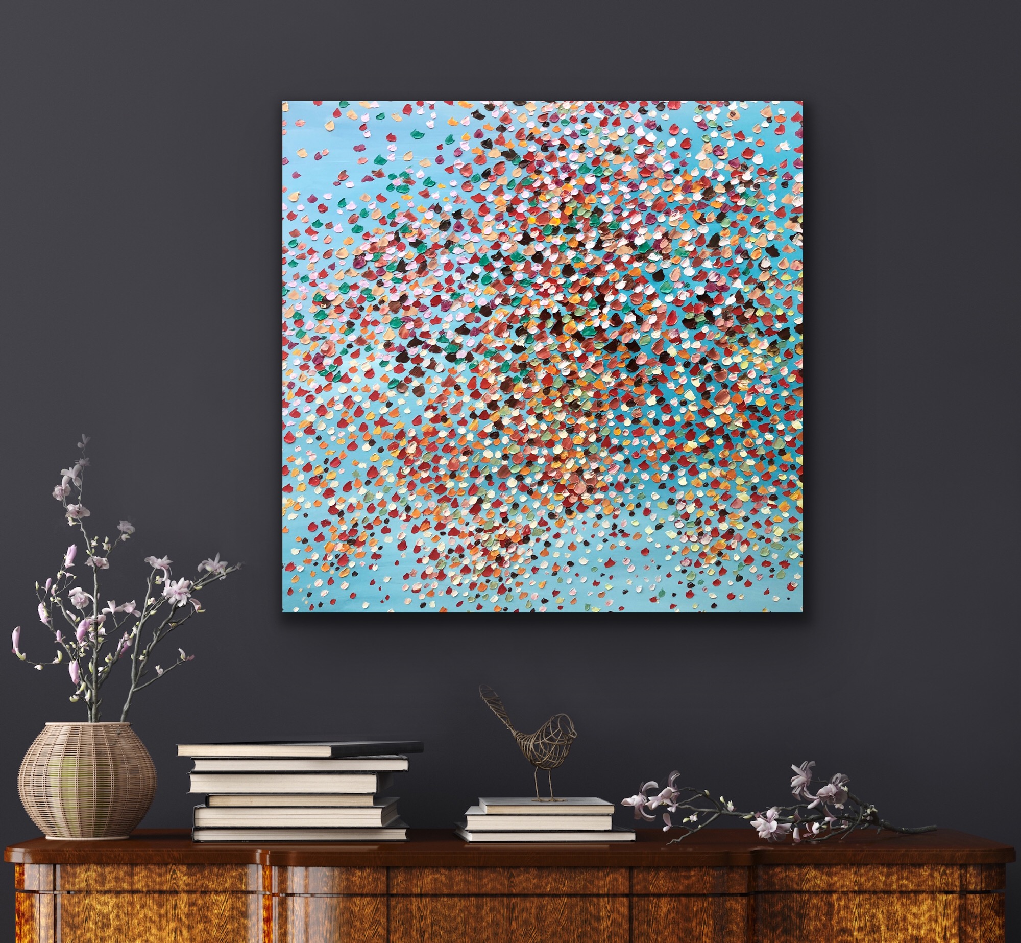 Beauty Blue by Theo Papathomas is a painting of various tones of blues covering the sky, painted in thick oil paints with a pallet knife to capture the richness of the coloured petals to give a lot of depth to the painting. Floating petals in the sky creating a veil falling onto the landscape .Hope with this s work it makes the viewer feel very peaceful and tranquil. This painting is signed and dated 2020 at the back of the painting and comes with a certificate of Authenticity.