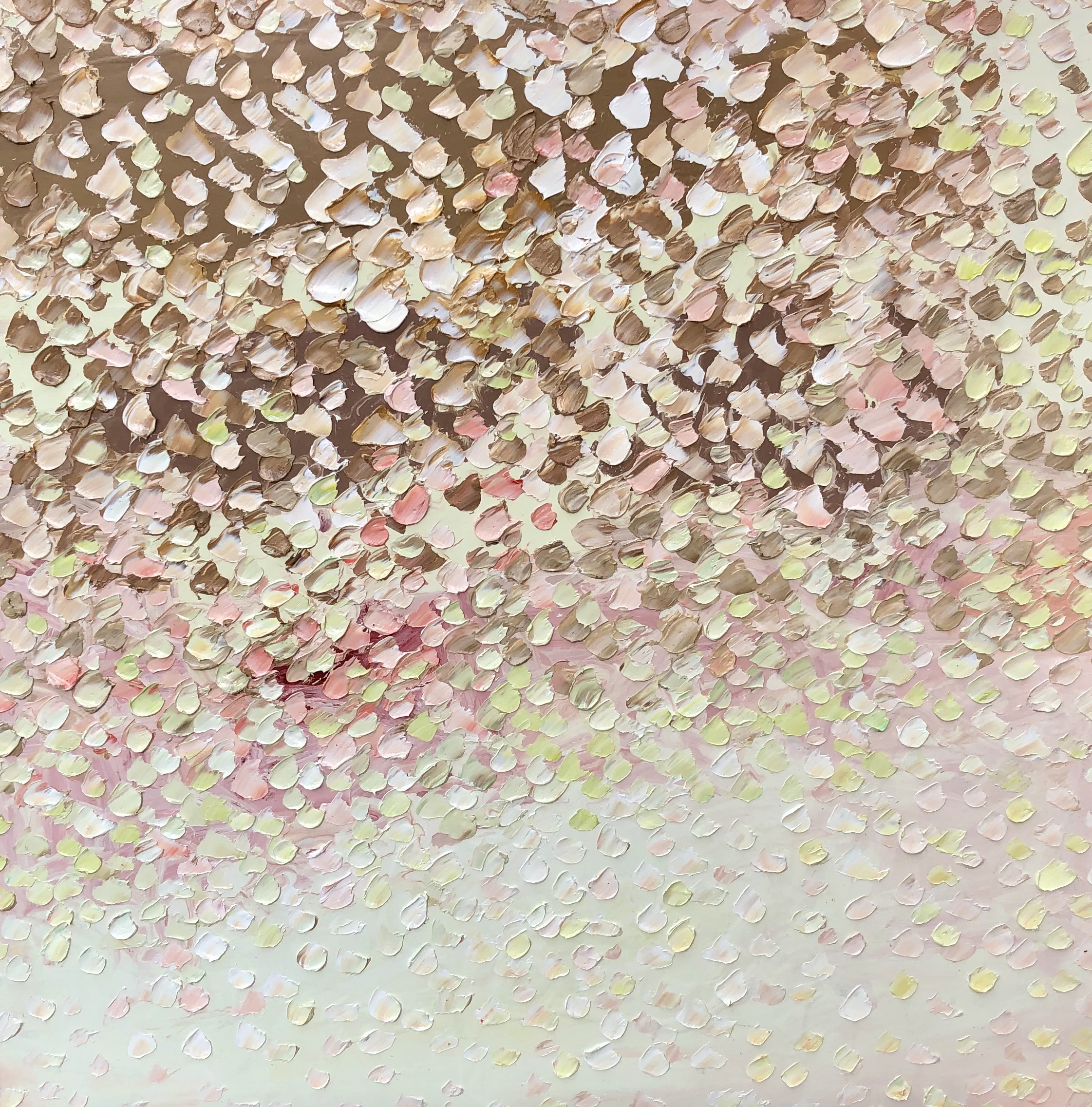 Beauty of Light by Theo Papathomas a painting with a very soft pallet of colours with weeping petals covering the landscape like a veil of petals . Natural earthy colours painted in thick oil paints with a pallet knife to capture the textures of the petals and give a lot of depth to the painting .Hope this work makes the viewer feel very peaceful and tranquil. This painting is signed and dated 2020 at the back of the painting and comes with a certificate of Authenticity.