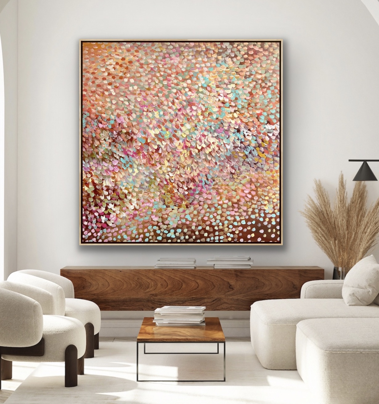 Beauty Within by Theo Papathomas a painting with beautiful colours of petals covering the whole landscape painted with lots of expression and freedom to create movement. Capturing the soft colours of the petals and foliage creating a beautiful bouquet of petals . A composition of colours and rhythms of petals dancing over the landscape swept by the winds . A very peaceful and tranquil painting with so much depth . The painting does not come with an external frame.The painting is signed and dated 2023 at the back and comes with a certificate of Authenticity.
