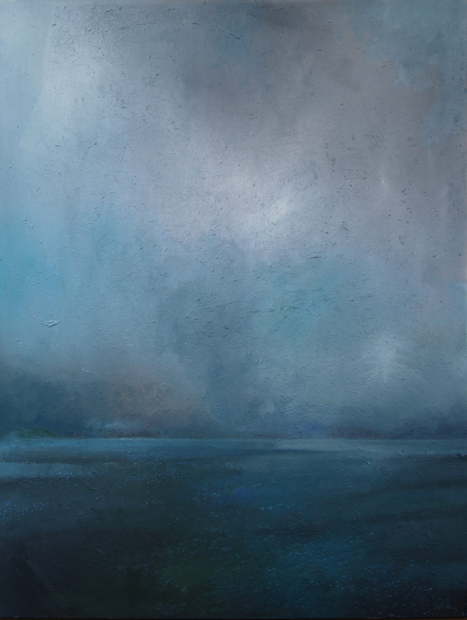 This large painting has depth with subtlety in the school of the tonalism movement. One can feel the rain and cool shift. A high level of texture and relief compliments the soft tonal application of the finest oil paints on stretched canvas ready to hang. Finest oil paints on stretched canvas ready to hang.